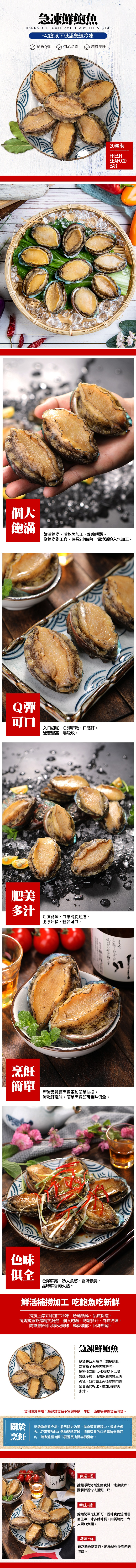•解凍料理方式 烹製時,先取出要吃的量解凍,裡面會有一些綠色的內臟,要去除乾淨,然後拿軟刷把鮑魚肉表面刷洗乾淨,特別是縫隙處一定要多刷幾遍。再依需求加入調味、蛋白、生粉、紹興酒等醃製,或快炒、白灼、煨製等方式處理,都十分美味! •食材保存方式※本商品採冷凍配送,收到商品後請立即冷凍保存。未食用完的食材也請勿重複冷凍再解凍以免影響新鮮度。※產品顏色可能會因網頁呈現與拍攝關係產生色差,圖片僅供參考,商品依實際到貨為準。※海鮮商品為維持品質新鮮度,於原產地作業時有做包冰處理,此作業會影響商品解凍後實際重量