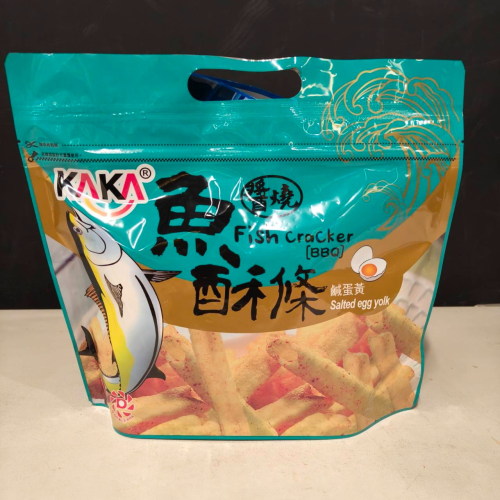 木薯粉、馬鈴薯粉、魚、砂糖、食鹽、棕櫚油、膨脹劑(碳酸氫鈉)、大蒜、鹹蛋黃粉、維他命E(抗氧化劑)、食用色素黃色5號