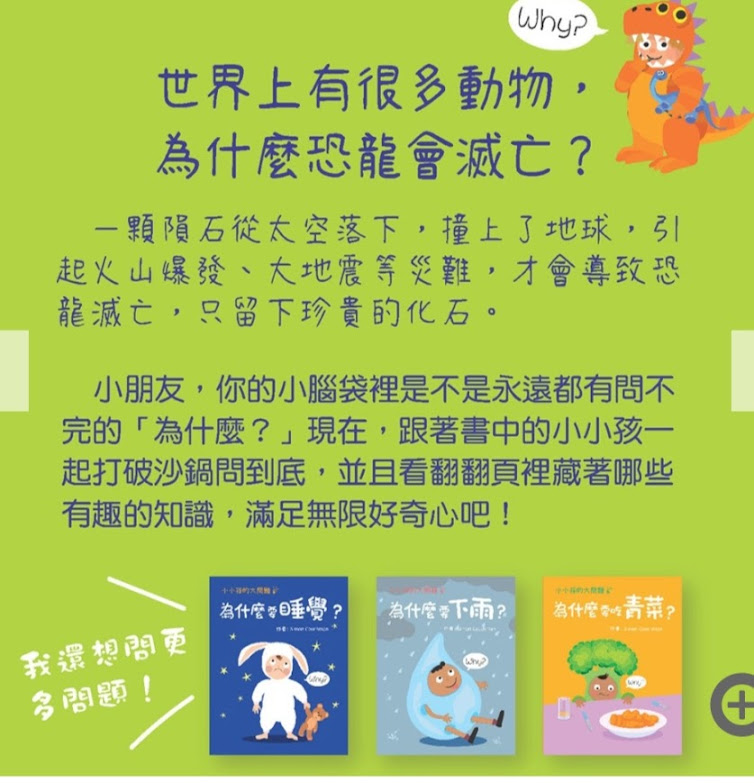 小孩3 歲左右時左腦開始成熟,自然而然就會問很多問題,孩子的分析、理解能力每天都在提高,但是家長要用他們可以完全理解的方式來回答問題是有困難的,規劃這系列的初衷,即是幫助家長以簡單有趣的方式回答孩子的疑問。