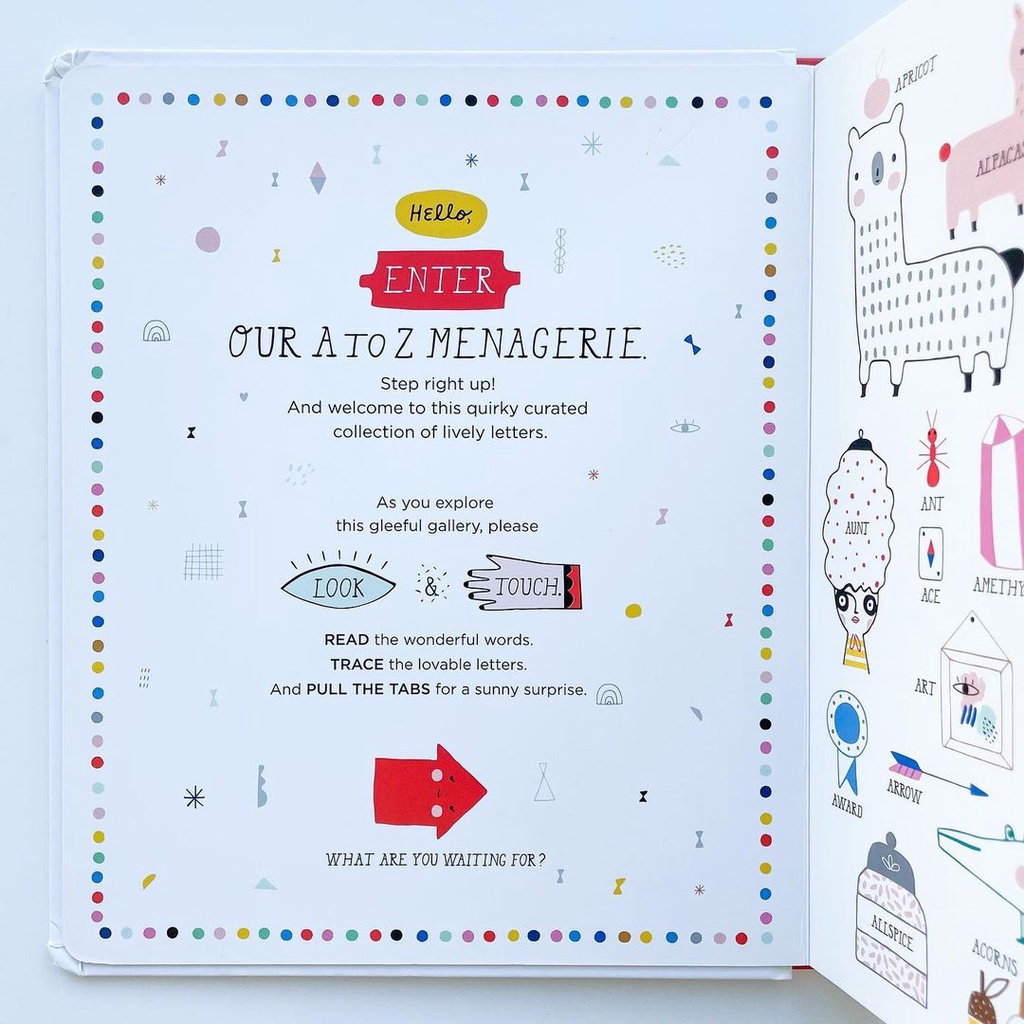 Step right up to Suzy Ultman's alphabet menagerie! This unique multisensory reading experience features a die-cut letter to trace and a satisfying pull-tab reveal for each letter of the alphabet. In addition, Suzy fills each page with a diverse and colorful collection of illustrated first words to find and identify―can you name them all? An alphabet book unlike any other, it's not only a feast for the eyes and the imagination, but educational value abounds, from promoting hand-eye coordination to prediction to rich vocabulary acquisition. Learning from A to Z has never been this charming!