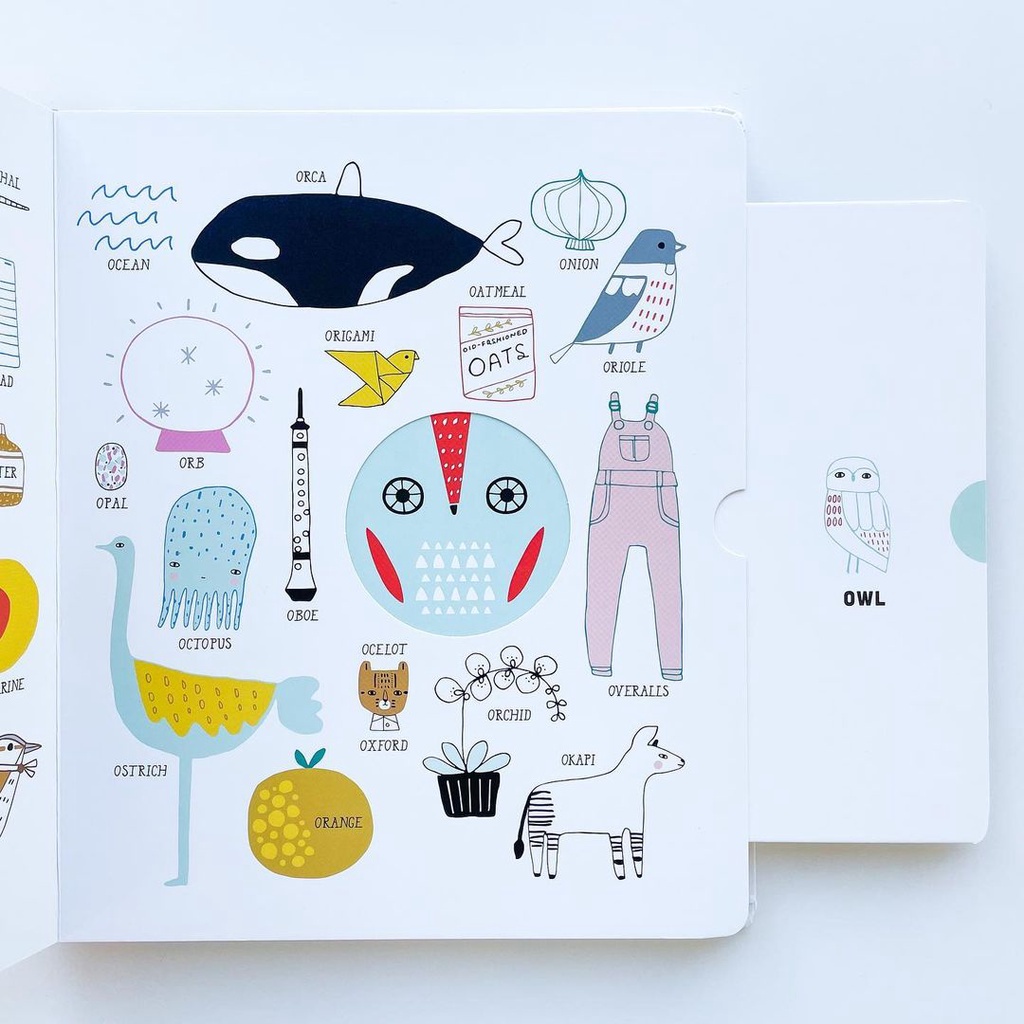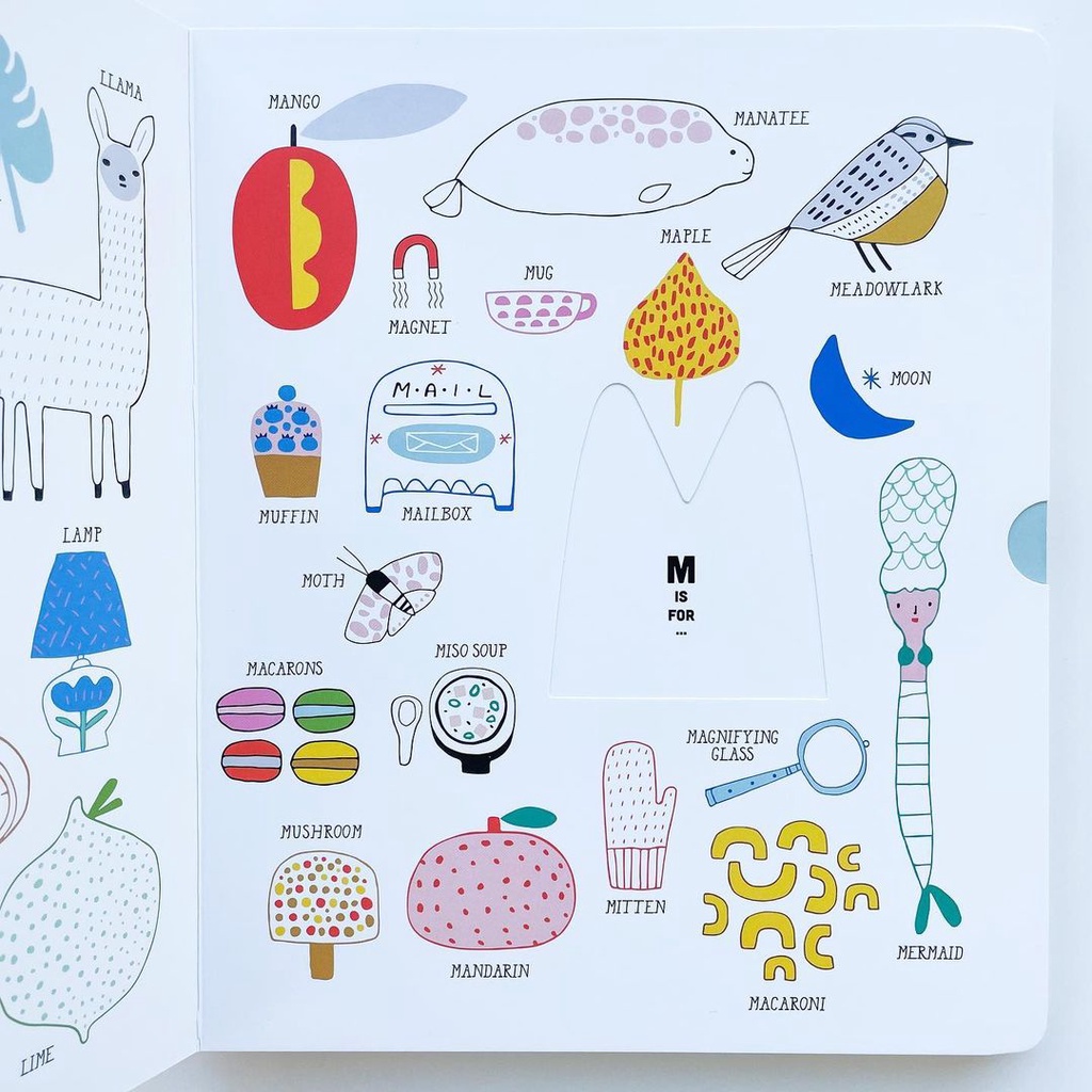 中央挖空的字母造型,變變變魔術,變出什麼呢?拉頁一拉開,D是圓圓的dounght甜甜圈,E是elephant大象!字母形狀和單字外型相近,讓初學字母的孩子對字母印象連結更強。字母造型之外,有大量相關單字,D提供了dolphin、dove、dice、dinosaur、desk等,約10-15個。單字實用常見,如miso soup﹙味噌湯﹚、macaroons﹙馬卡龍﹚,線條簡筆童趣風,白色為底,用色柔和,是一本清新的字母單字書。