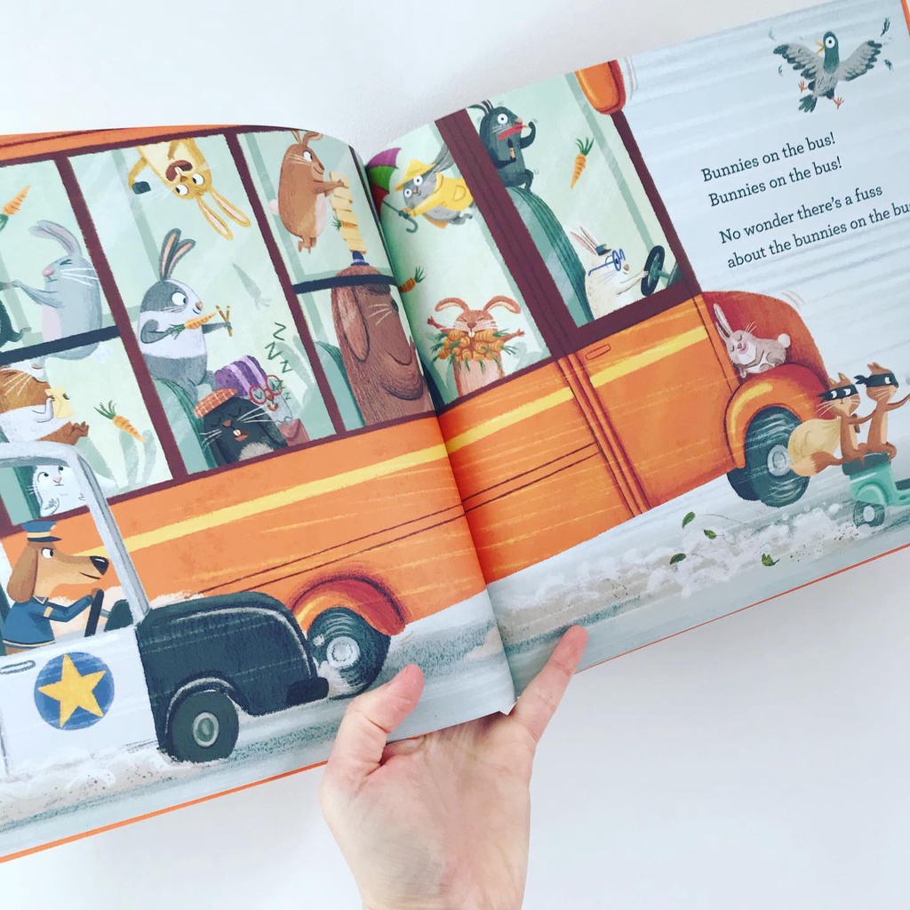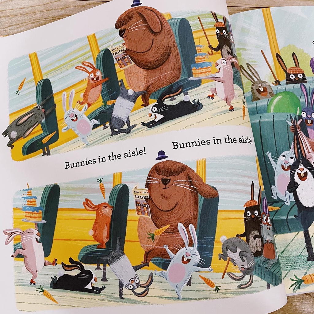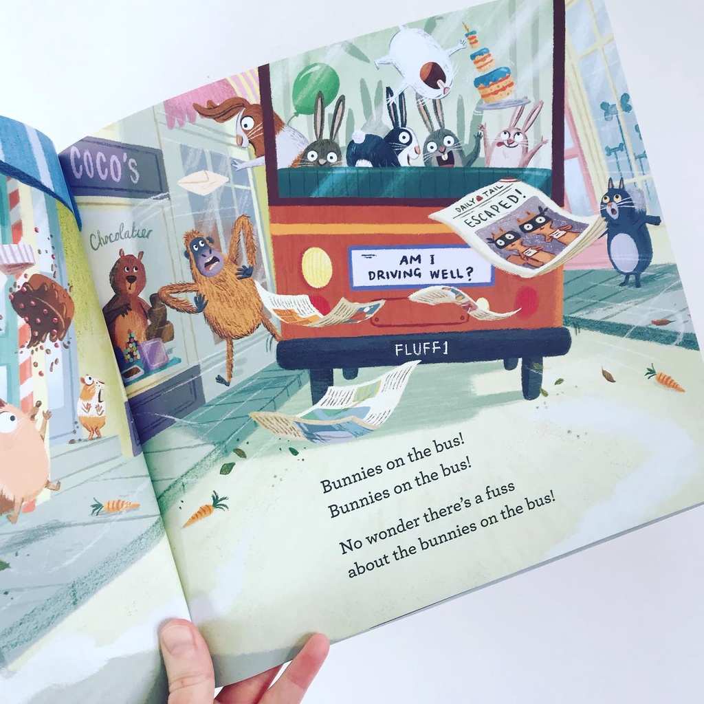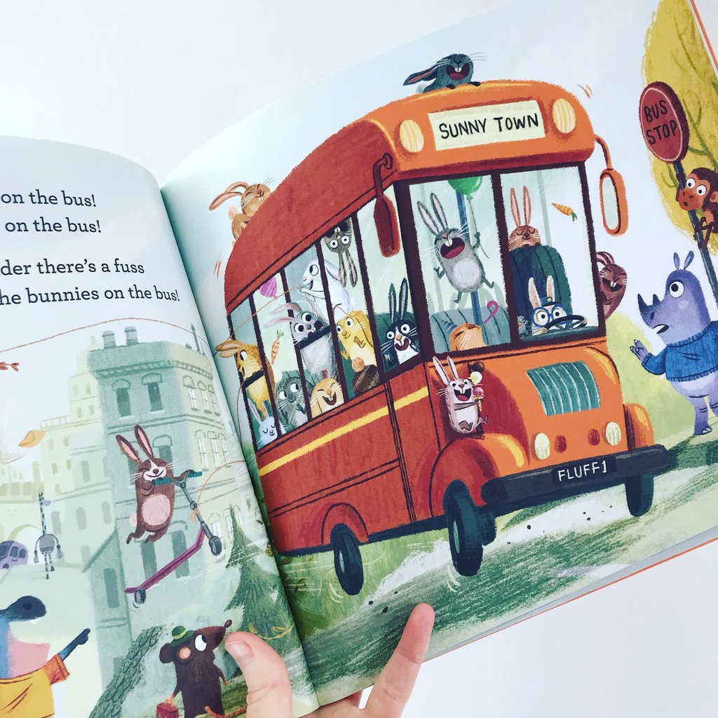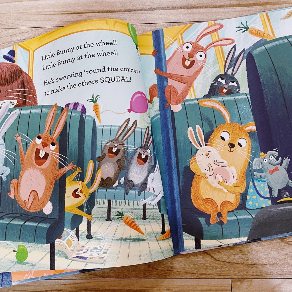 Watch out! Move out of the way! Hold onto your tails! There are ... BUNNIES ON THE BUS! And they aren't stopping for ANYONE!The bunnies have taken over the bus and they're on a wild ride across the streets of Sunnytown! They whizz past the bus stop, swerve around corners and zoom over crossings on a non-stop roller coaster adventure! There are bunnies on the roof! Bunnies in the aisle! DO sit down, bunnies, or you'll end up in a pile! Eventually, they come to a stop ... at the train station.