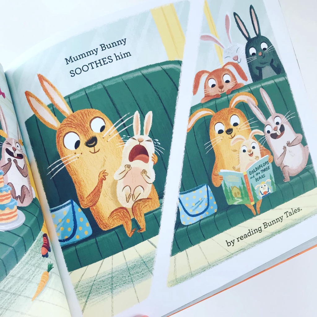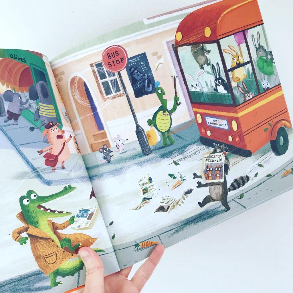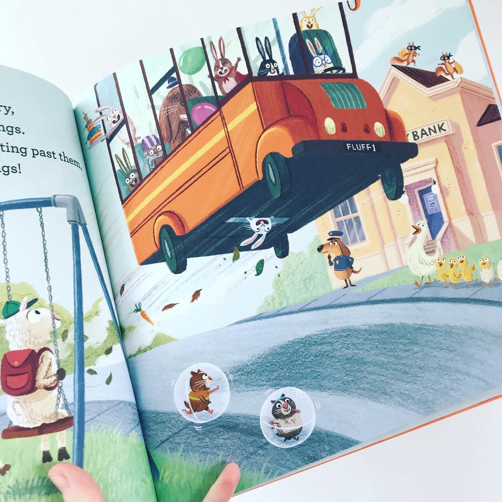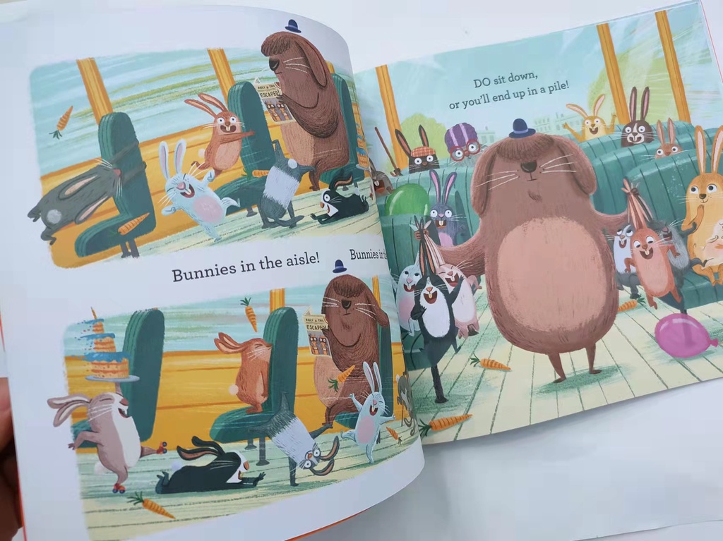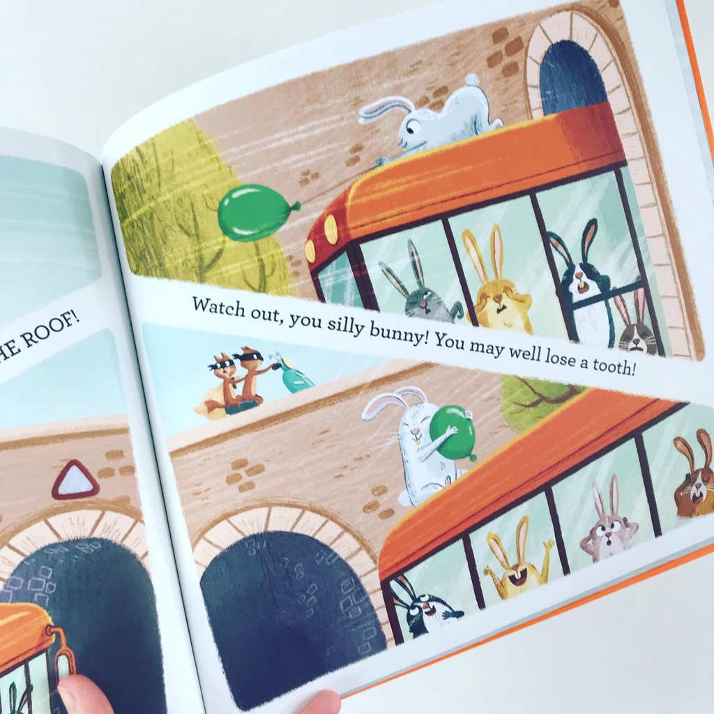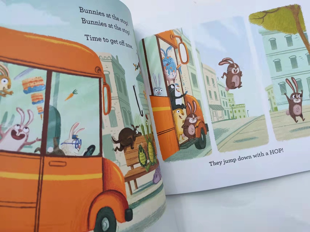 Watch out! Move out of the way! Hold onto your tails! There are ... BUNNIES ON THE BUS! And they aren't stopping for ANYONE!The bunnies have taken over the bus and they're on a wild ride across the streets of Sunnytown! They whizz past the bus stop, swerve around corners and zoom over crossings on a non-stop roller coaster adventure! There are bunnies on the roof! Bunnies in the aisle! DO sit down, bunnies, or you'll end up in a pile! Eventually, they come to a stop ... at the train station.