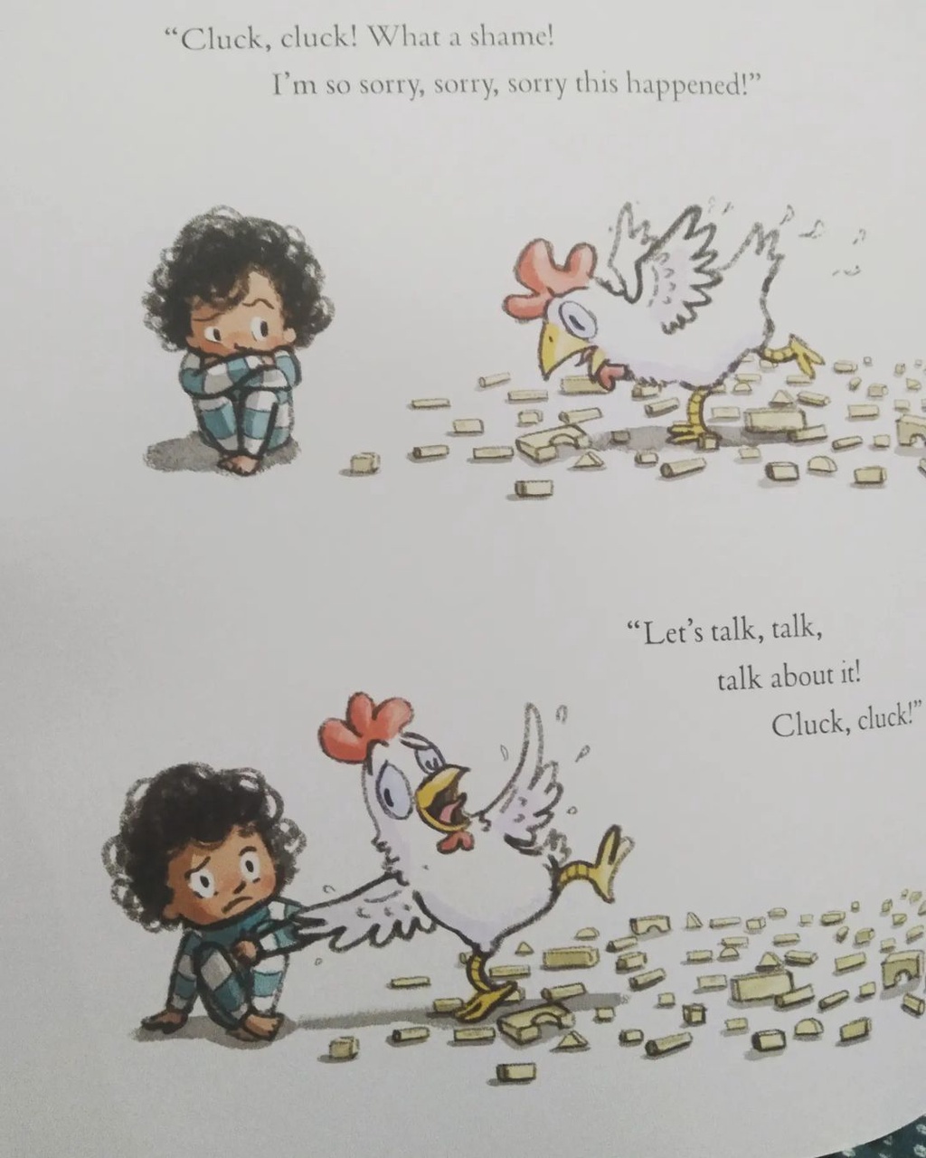 沒有一個情緒是不被需要的,這本書並未去批評、壓制任何一個情緒,事實上小男孩泰勒也的確擁有所有的情緒,每一個都幫助他度過悲傷,鼓起勇氣構築一個更大、更完美的大樓,但是誰幫助他找到與這些情緒相處的方式?是兔子。