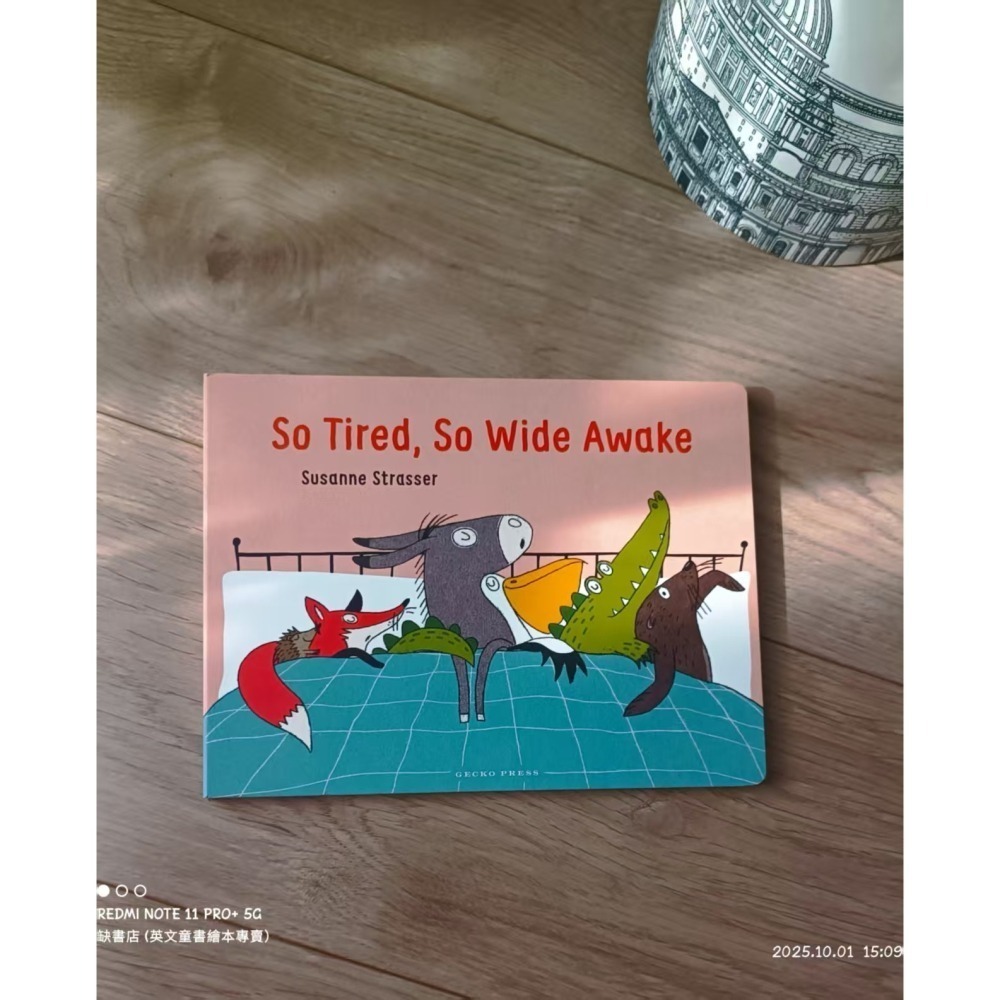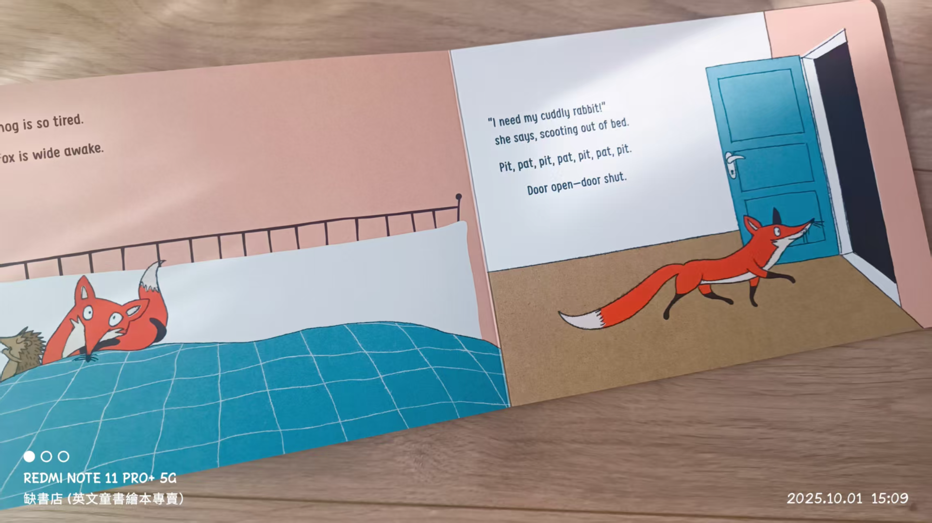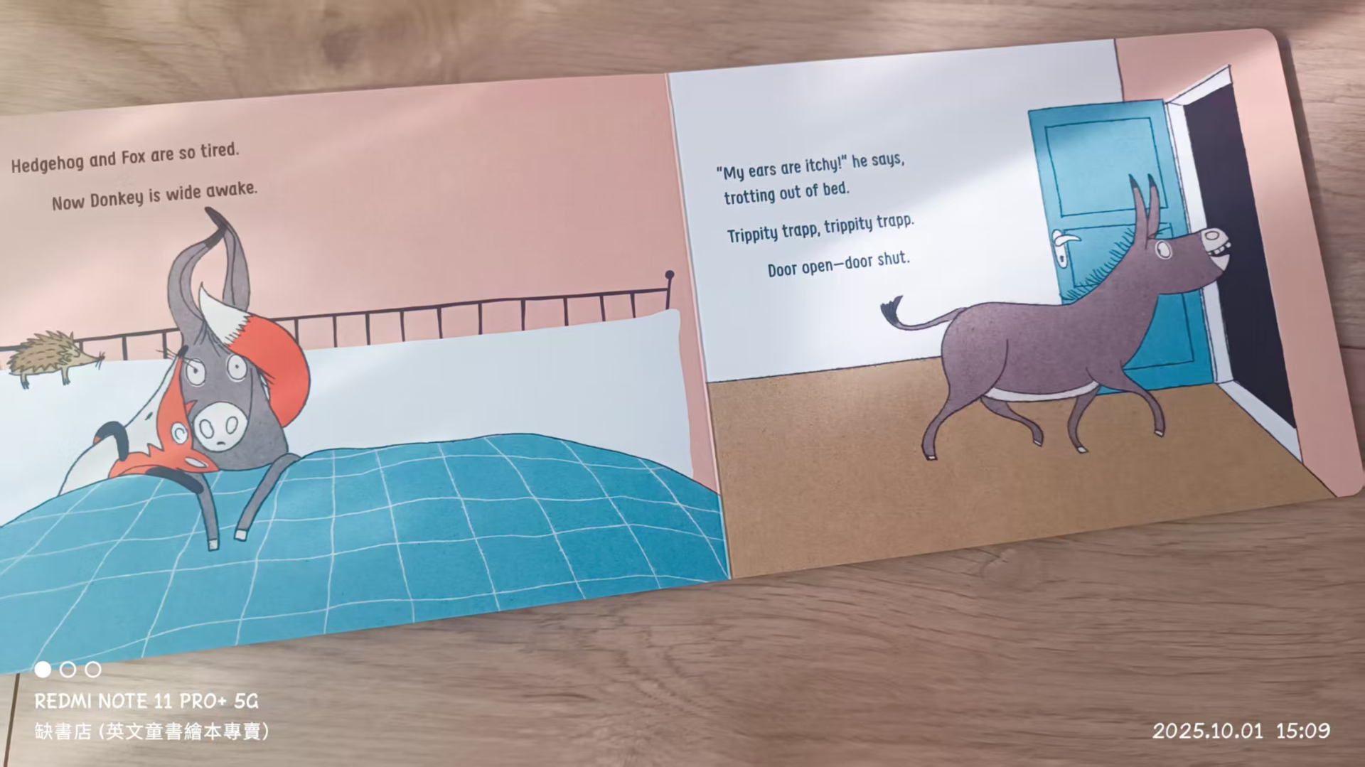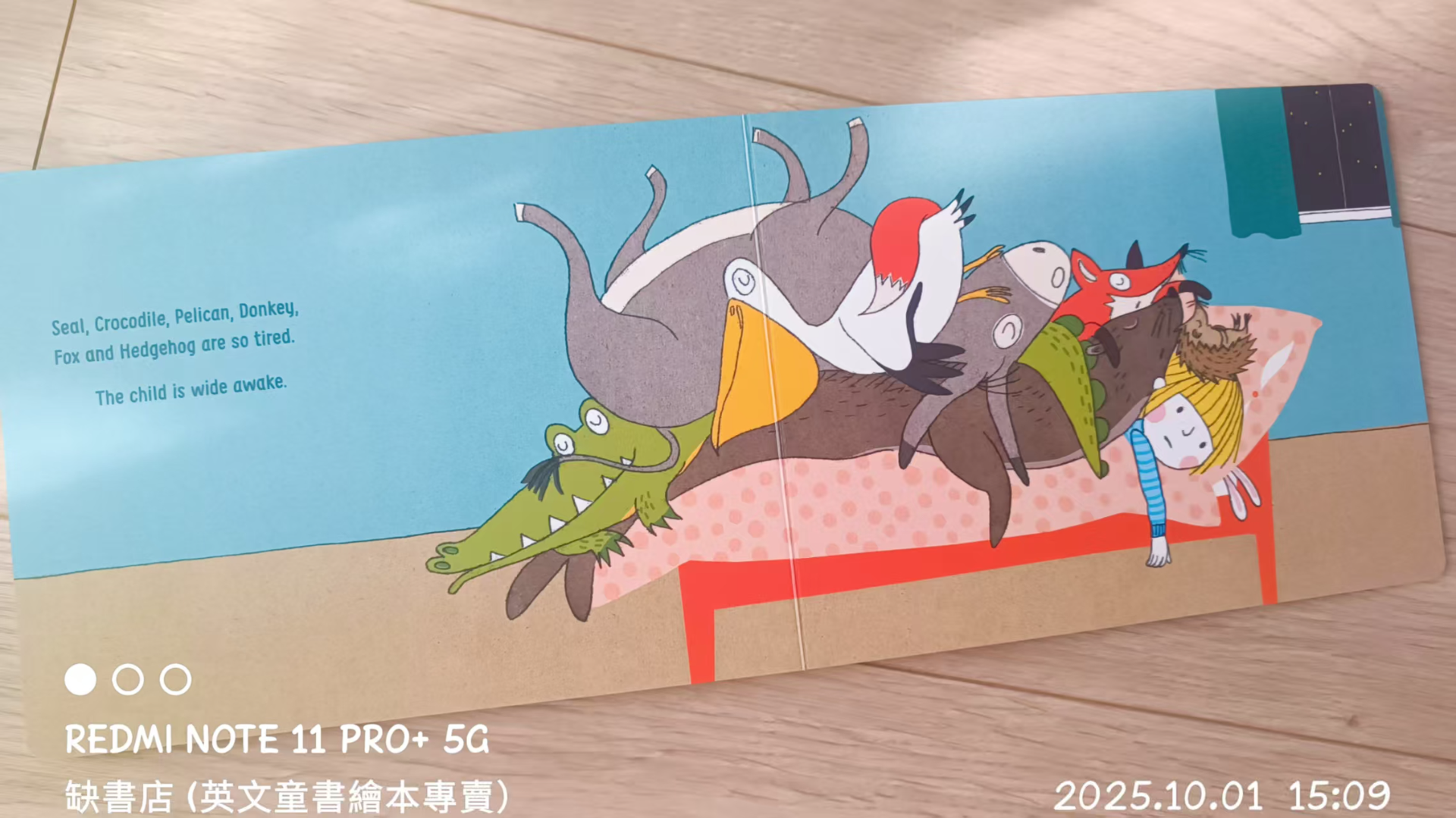It's bedtime. Hedgehog, Fox, Donkey, Pelican and Crocodile are so tired! But Seal needs to use the bathroom---slip slap slip, out the door. Crocodile forgot to clean those sharp teeth---shlurf shlurf, out the door. And Pelican is thirsty . . .