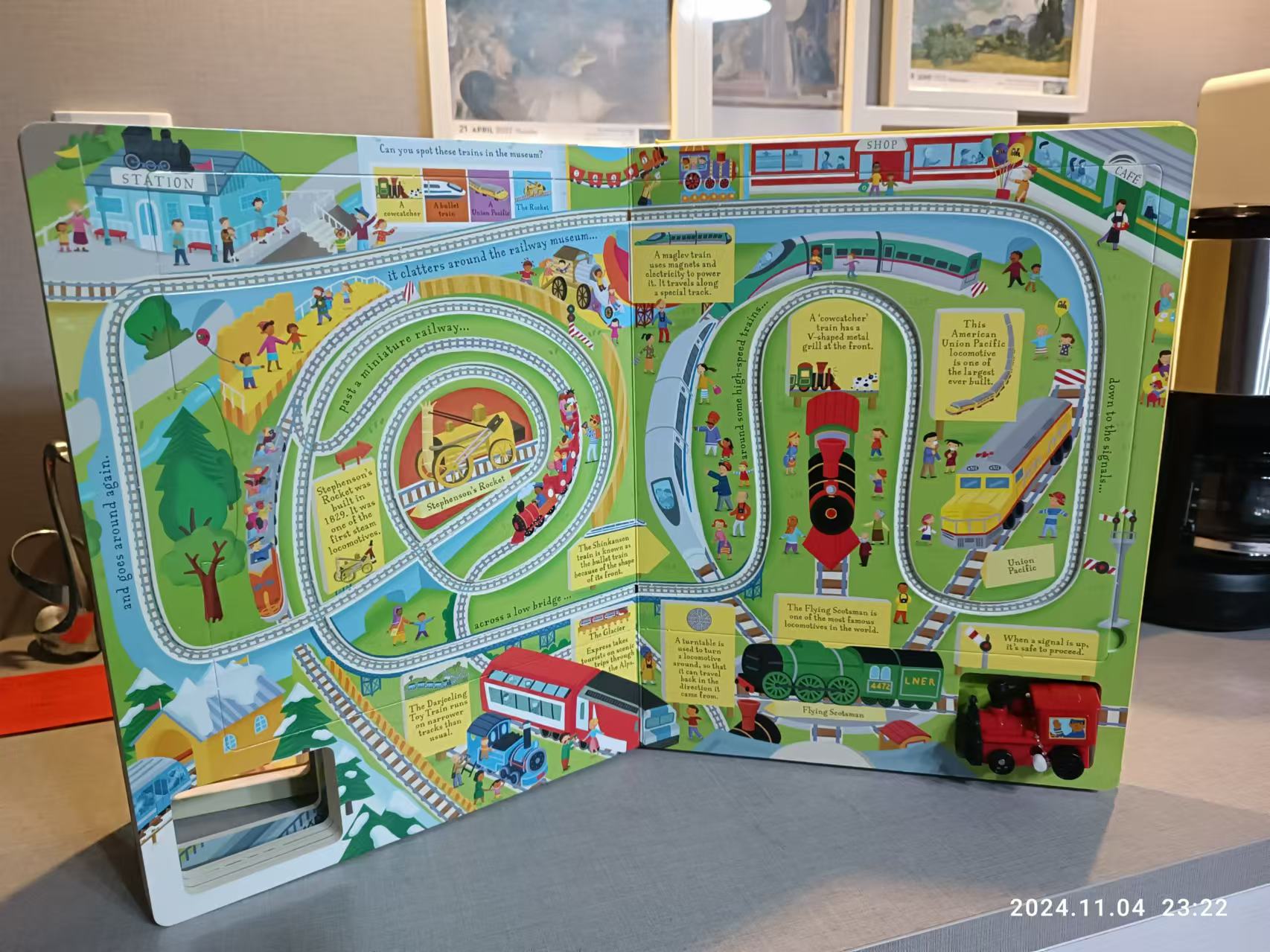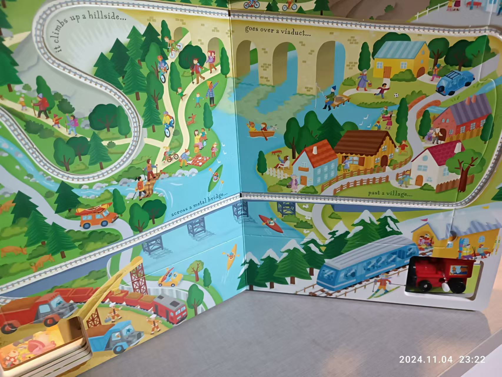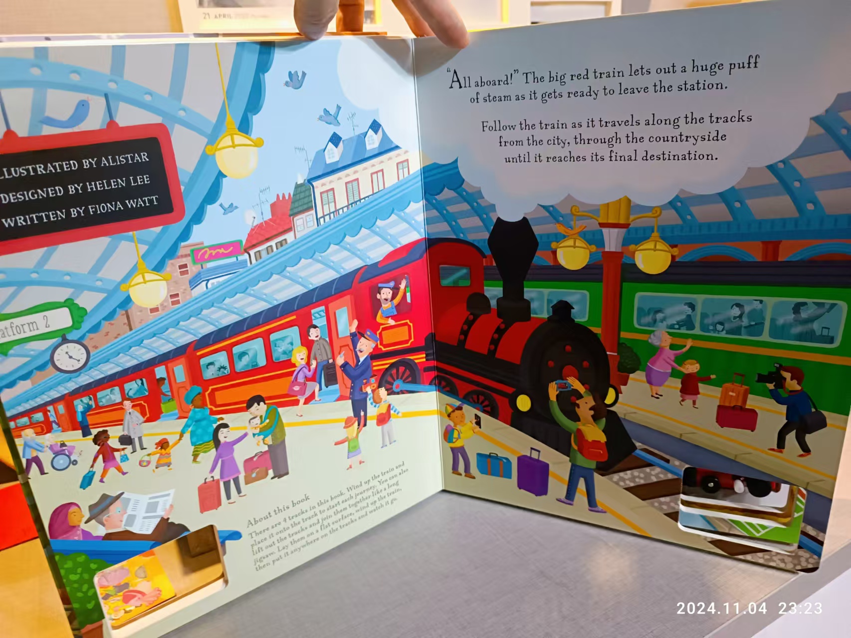 A toy and a book in one, this large, chunky board book comes with a wind-up toy steam train. Wind the train up and set in on the embedded track in each page to see it chugging along through the countryside. Each of the four tracks is removable, and together they combine to make one giant train track.