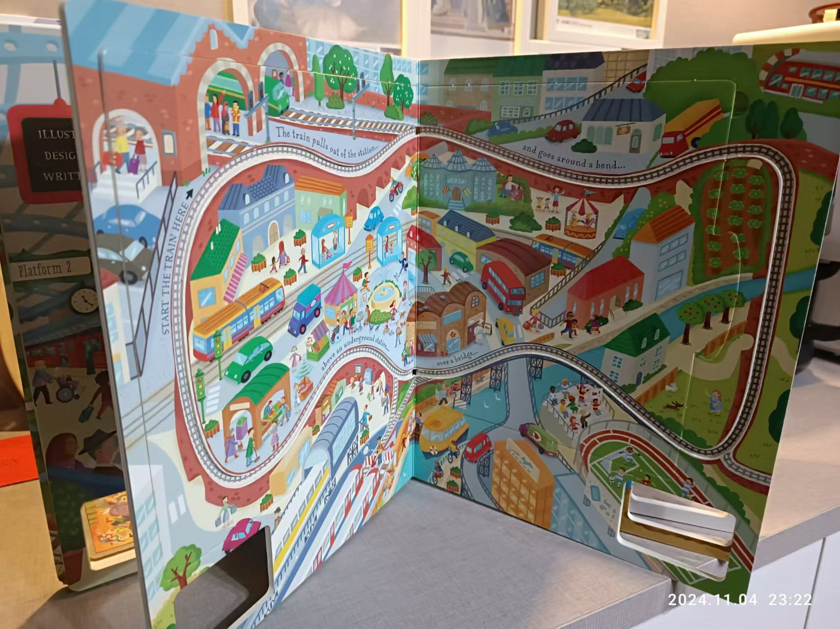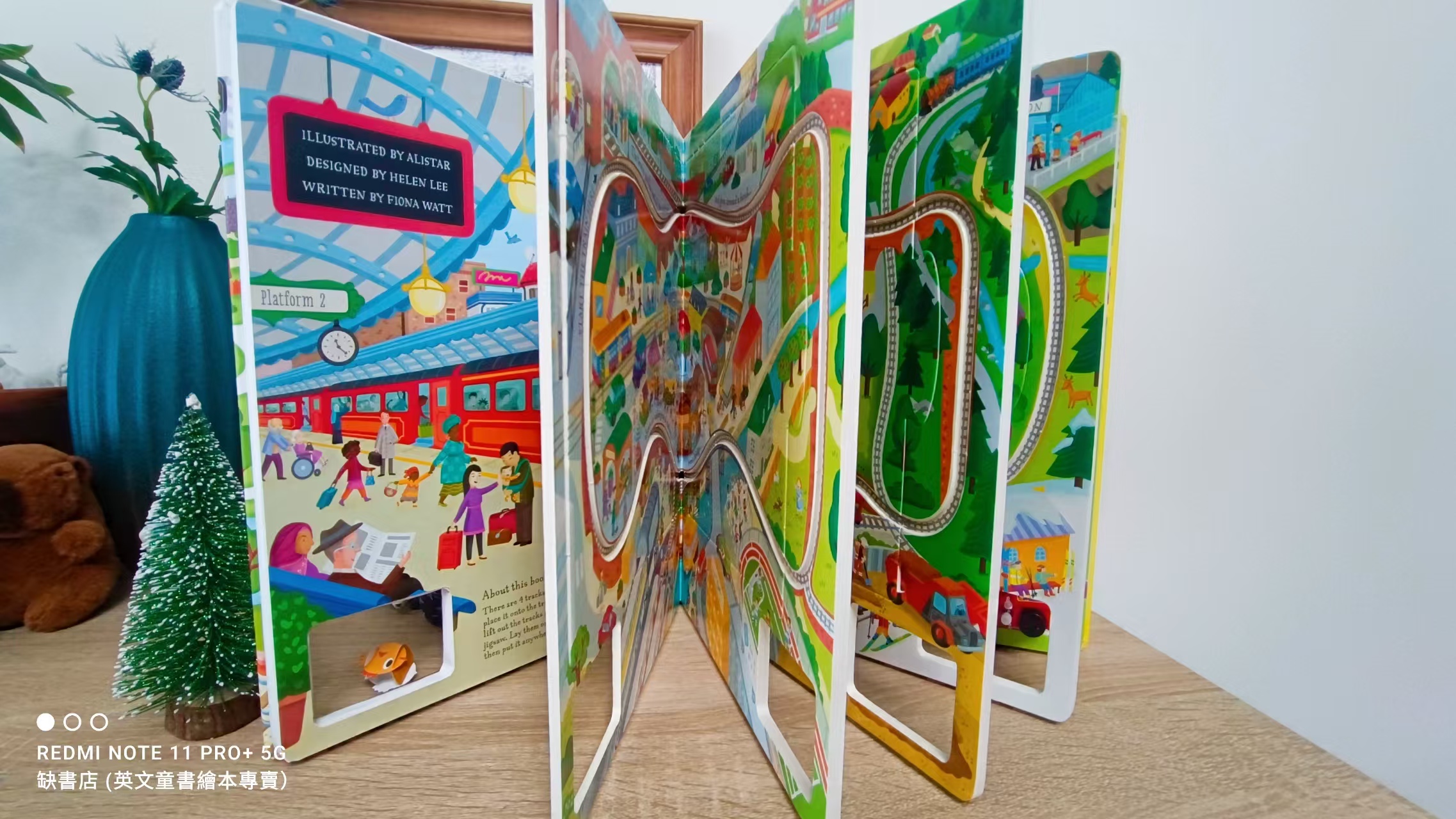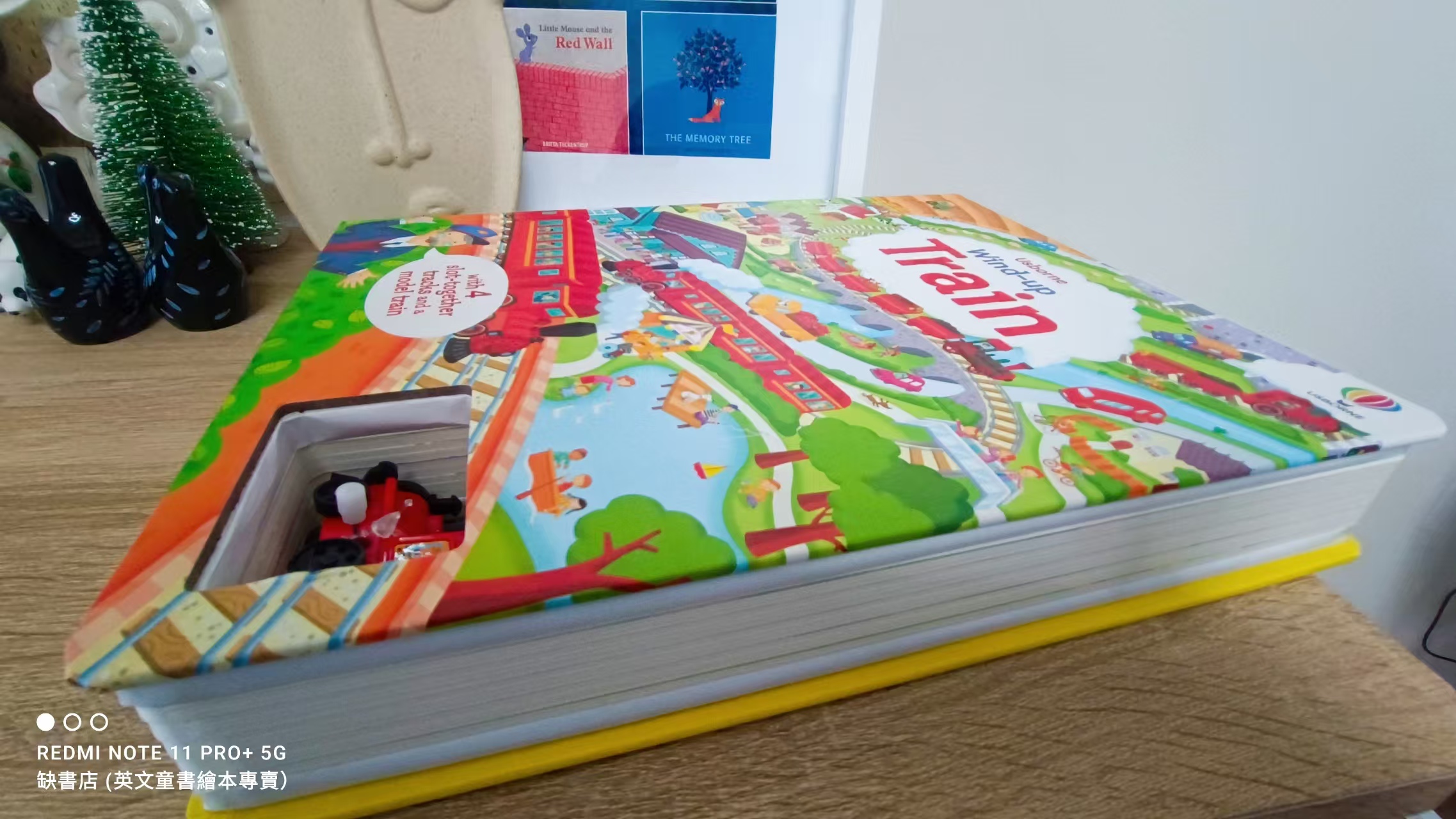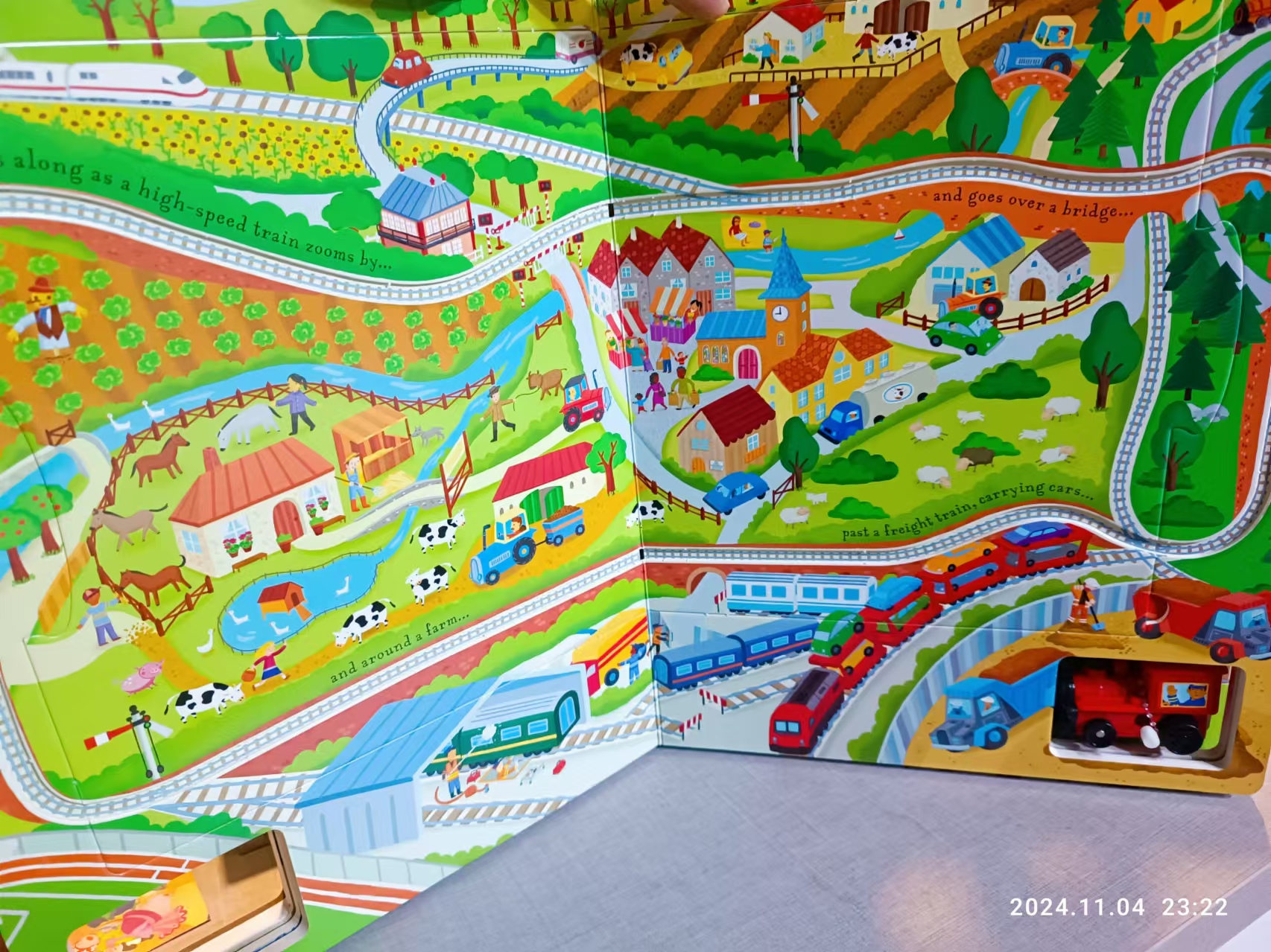 A toy and a book in one, this large, chunky board book comes with a wind-up toy steam train. Wind the train up and set in on the embedded track in each page to see it chugging along through the countryside. Each of the four tracks is removable, and together they combine to make one giant train track.