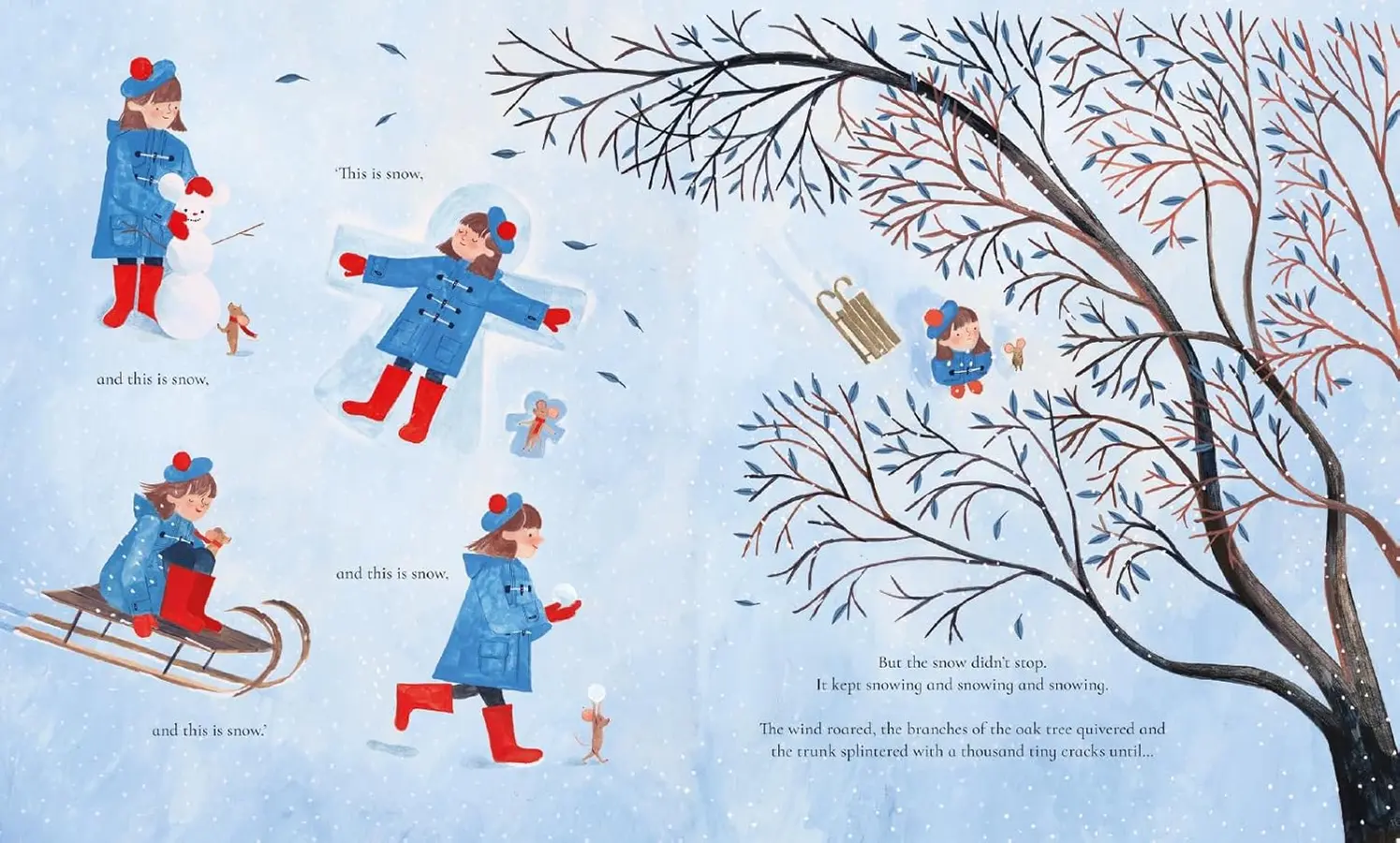 作者Grace Easton以生動的插畫與手繪場景,講述困難的時刻中,小女孩對小老鼠伸出援手,一起克服難關的溫暖故事。書中22個精緻的翻頁互動設計,細膩呈現布置典雅的家居場景和大雪紛飛中的迷人白色大地,吸引讀者走進優雅的冬日風景,一起在溫暖的氛圍下,展開雪中的魔幻冒險。