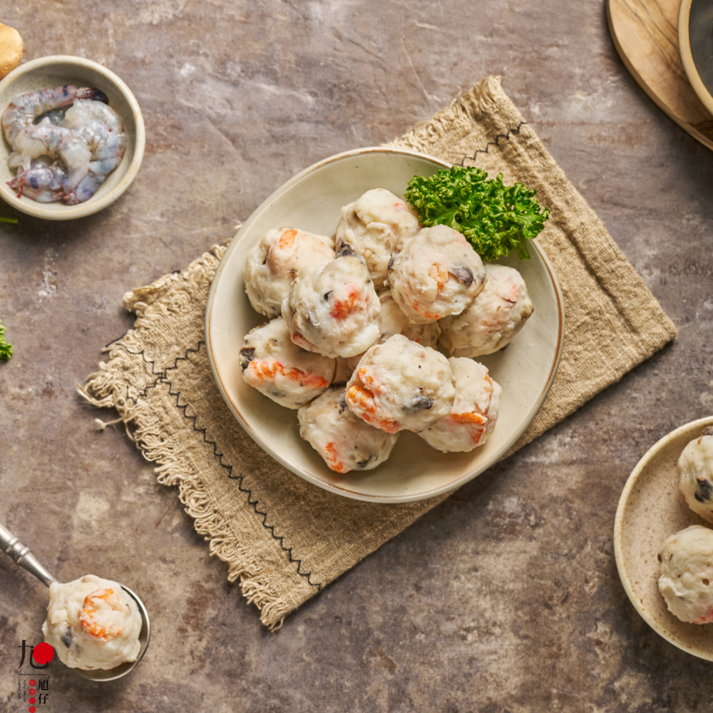 我們直接 放入整隻蝦仁,搭配 大火快炒香菇提香,再用 旭仔花枝漿為基底手工製作。每一口都能吃到 彈牙花枝與蝦仁的雙重口感,彷彿整個大海的鮮甜在嘴裡開派對!