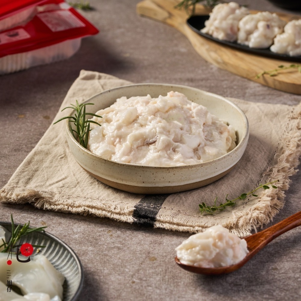 花枝漿採長方 PP 盒包裝,封口膜撕開即可下鍋烹煮