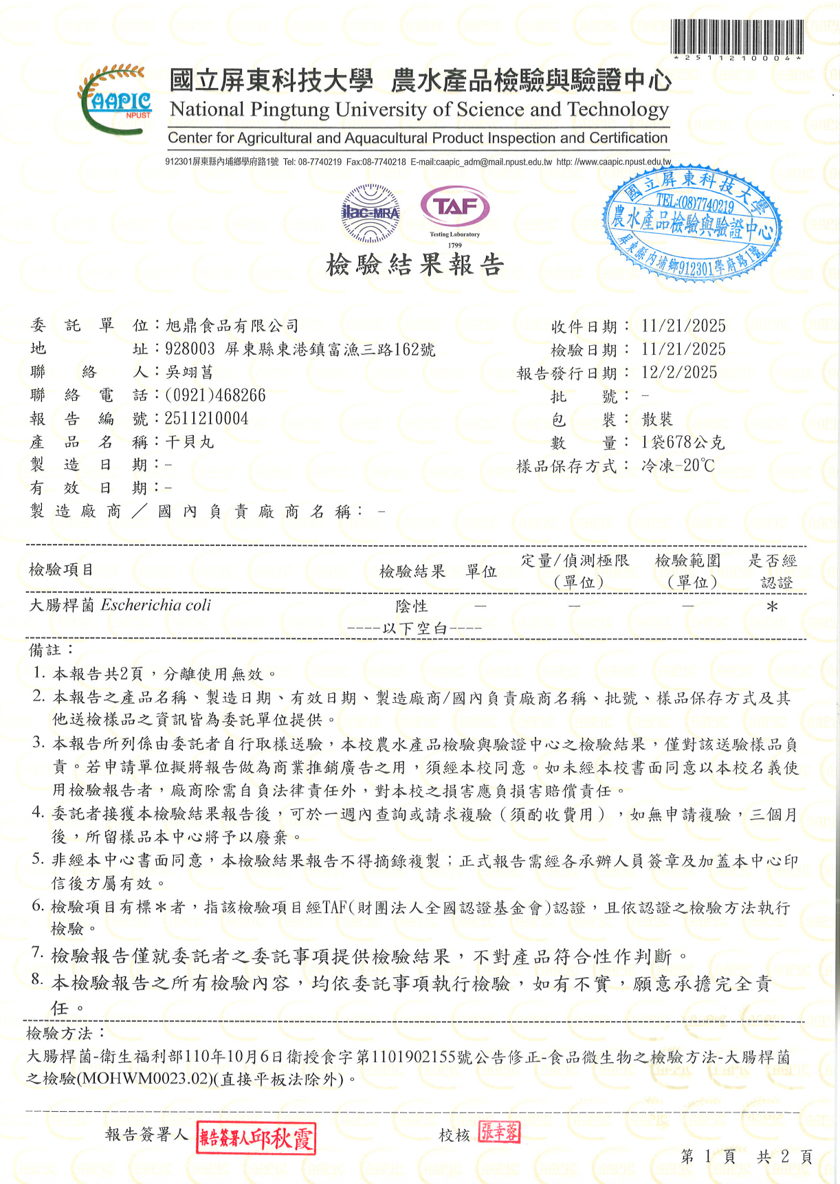 產品內容物:花枝、干貝、磷酸二澱粉、旗魚漿、香菇、豬背脂油、食鹽、L-麩酸鈉、品質改良劑(多磷酸鈉、焦磷酸鈉)、甜味劑(蔗糖素)