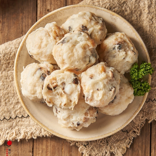 干貝丸以招牌花枝漿為基底,加入 大火快炒過的香菇,