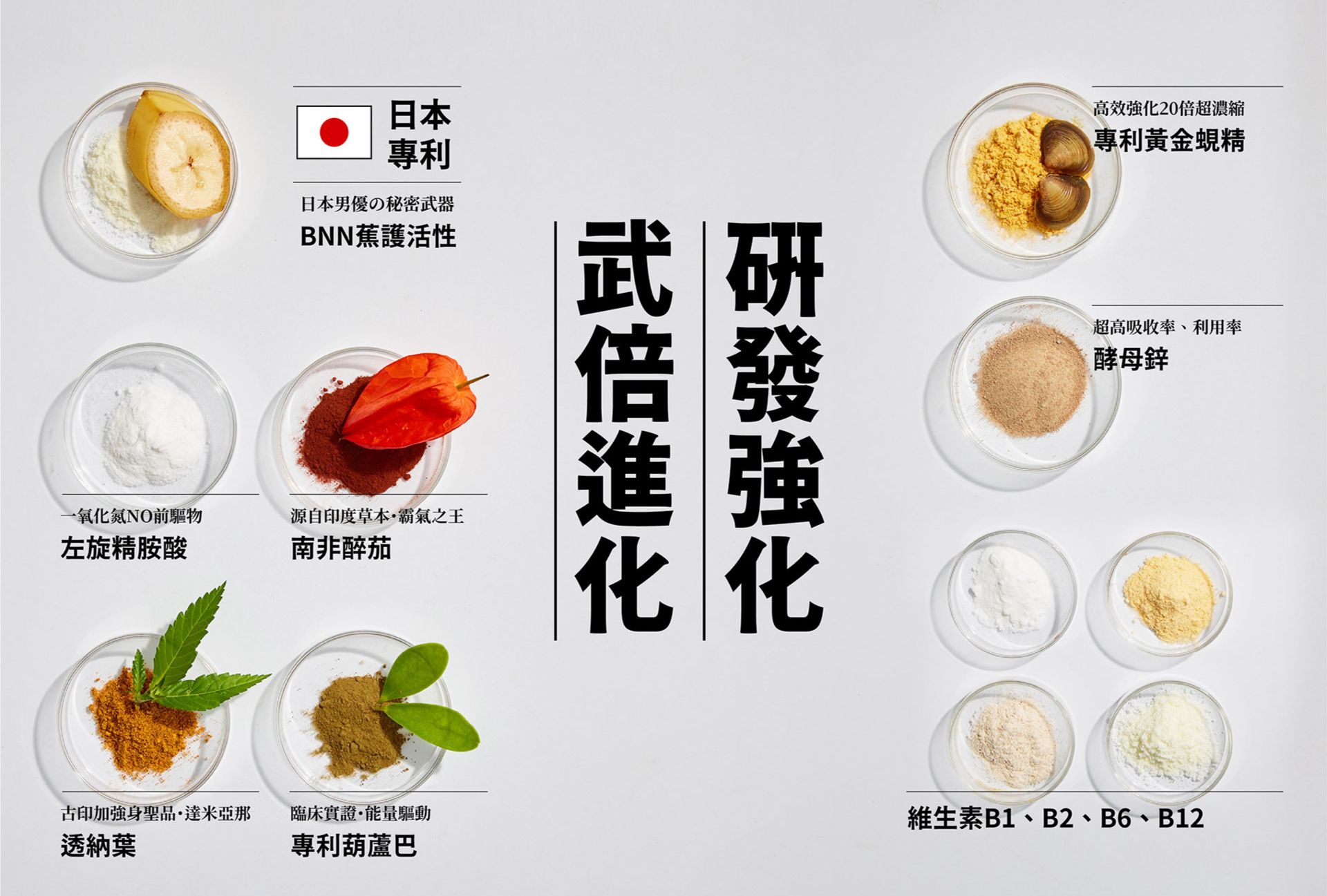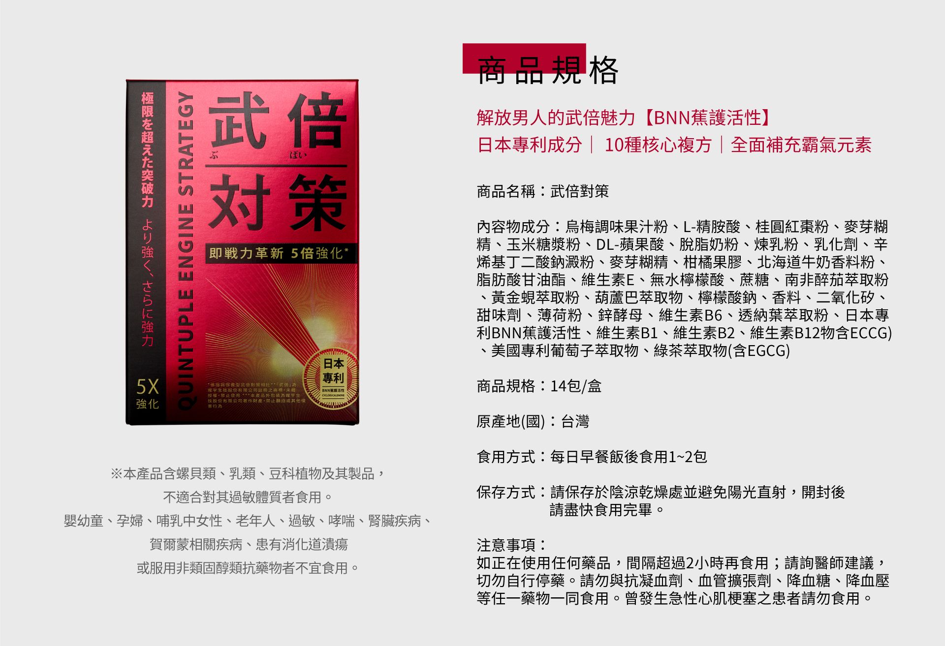 武倍對策,日本專利BNN蕉護活性5倍強化,為追求超越自己、強要更強的男性打造,增強體力、精神旺盛,榮獲世界品質標章認證,藥局熱銷領導品牌! 【強要更強,戰力保健】 - 5倍強化*|提升霸氣.百戰極品 - 日本專利成分|男人的秘密聖物 - 10種核心複方|全面補充霸氣元素 - 營養師楊灼華|專業指名推薦