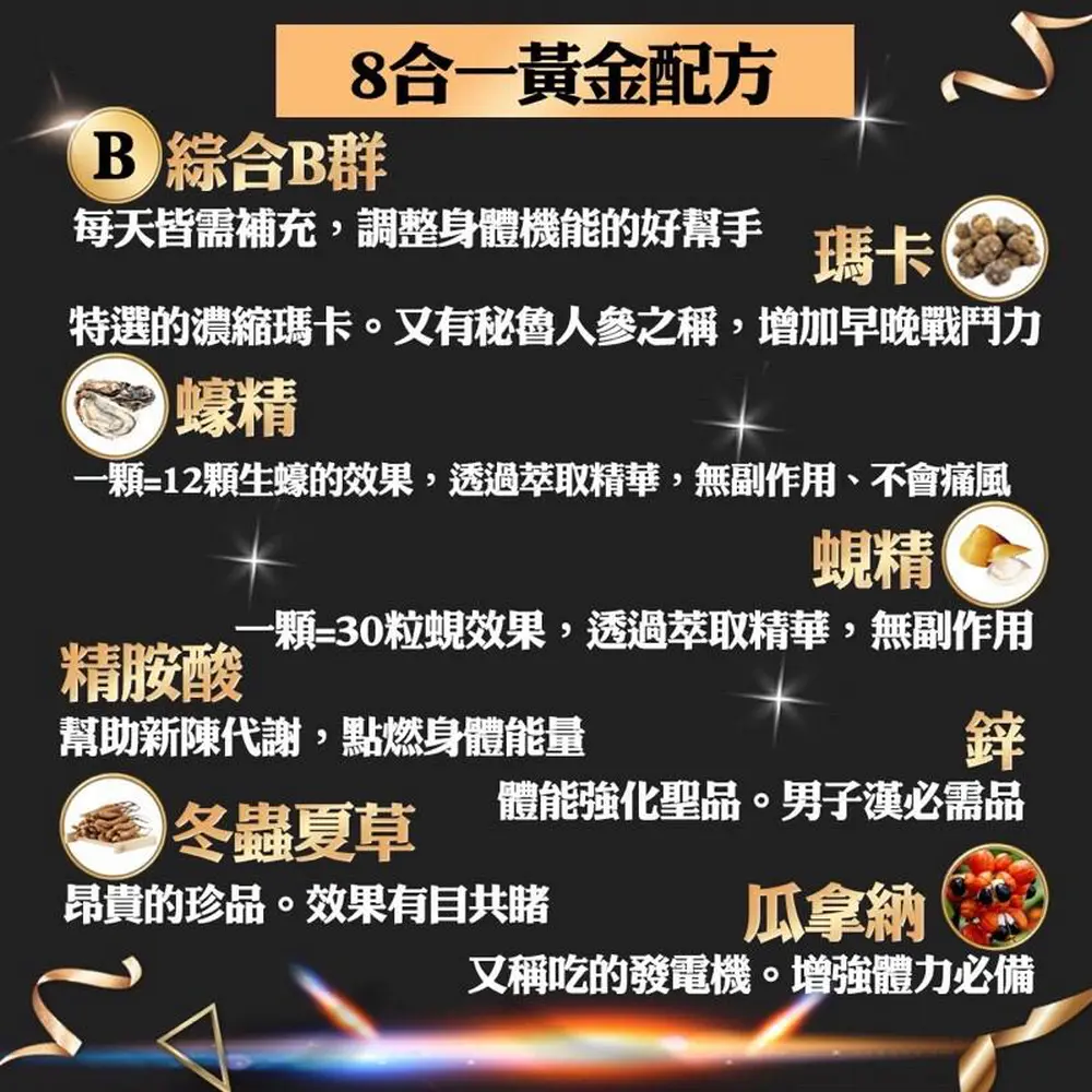 ⚠️別在瓶瓶罐罐 All in one配方: 綜合B群—B1.B2.B6補充每天體力流失 瑪卡—給你滿滿能量 蠔精—真男人必備 蜆精—華人強調活力來源 精胺酸—幫助新陳代謝 鋅—愉悅興致 冬蟲夏草子實體—珍貴好物 瓜拿納—吃的發電機 另還有紅景天、刺五加等多種輔助成份
