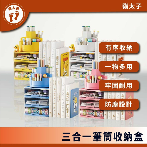 『來人客』 貓太子 三合一筆筒收納盒 旋轉筆筒 文具收納 桌面收納盒 收納盒 360度旋轉 書架 辦公收納