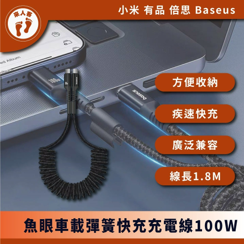 『來人客』 倍思 魚眼車載彈簧充電線 快充 Type-C 100W CarPlay 手機充電線 PD充電 快充線