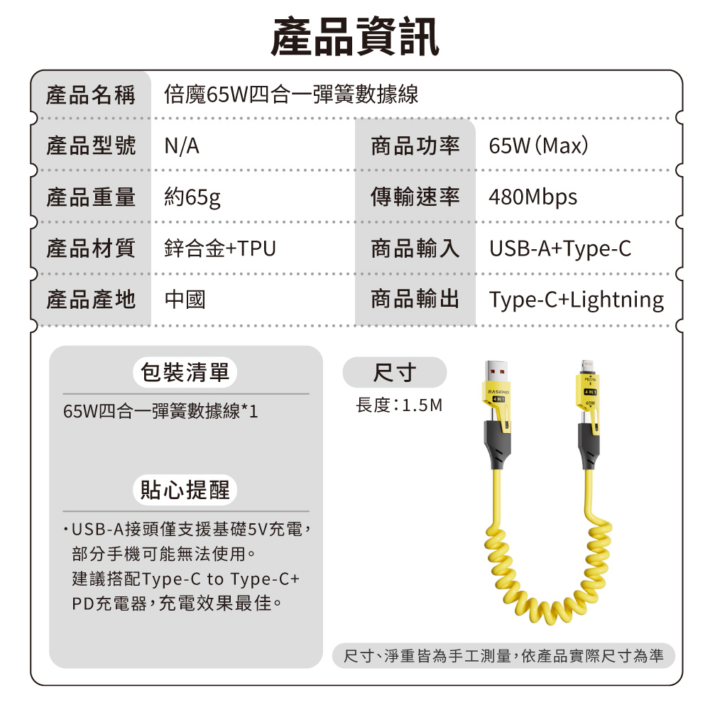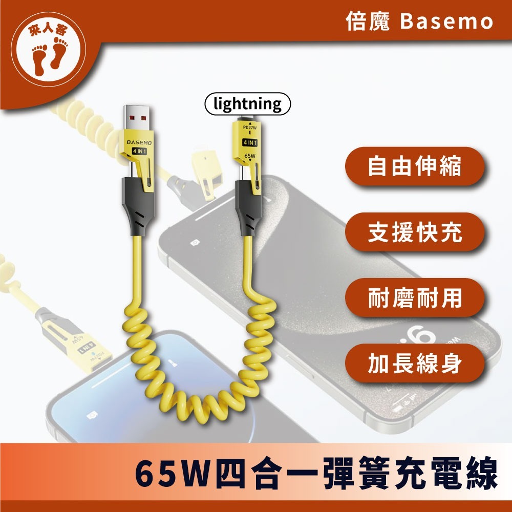 『來人客』 倍魔 65W四合一彈簧充電線 快充 Type-C 手機充電線 PD充電 快充 蘋果充電線