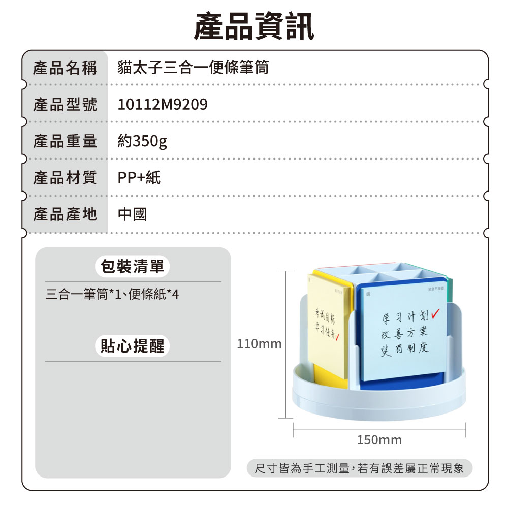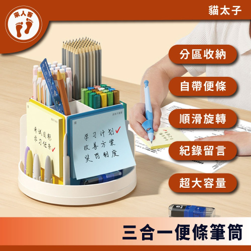 『來人客』 貓太子 三合一便條筆筒 三合一筆筒 便條筆筒 360度旋轉筆筒 文具收納盒 分隔收納筆筒 旋轉筆筒