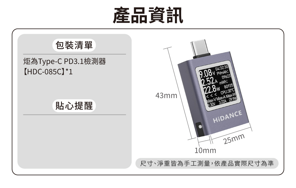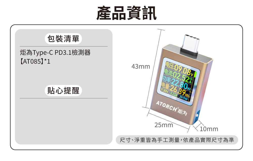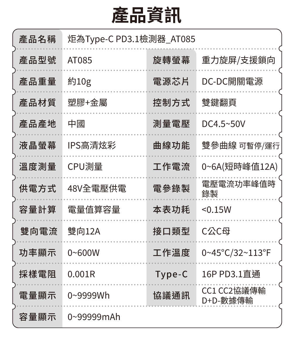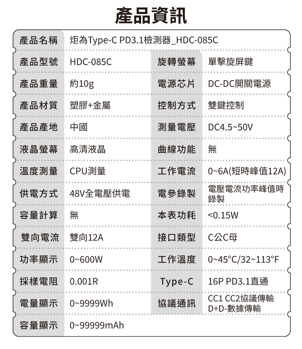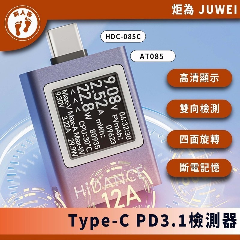 『來人客』 炬為Type-C PD3.1檢測器 彩色版 電壓 電流 AT085 測試器 HDC-085C 檢測儀