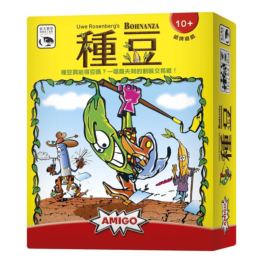 遊戲名稱:種豆 遊戲類型:談判/交易/吹牛/親子/派對 遊戲時間:45分鐘 適合人數:3~5人 得獎項目: ★1997 德國年度遊戲獎推薦 ★1997 德國玩家票選最佳遊戲第5名 ★1999 美國遊戲雜誌獎最佳家庭紙牌遊戲 遊戲介紹:種豆真能得豆嗎?一場農夫間的割喉交易戰! 農家樂作者 Uwe Rosenberg 早期創意驚奇之作!種豆子這件事情出乎意料的有趣! 遊戲中擁有的豆子田,總是不夠容納所有你要種的豆子,因此經常要收割豆子賣掉後再種其他的豆子。賣豆子時,同一種豆子越多越賺錢,太少的豆子會連1毛錢都賺不到。因此你要盡可能用手上不想要的豆子,跟其他玩家換得你想種的豆子。 藉由巧妙的交易手腕,對其他玩家略施小惠,以賺得更多的金幣,金幣最多的玩家獲勝。