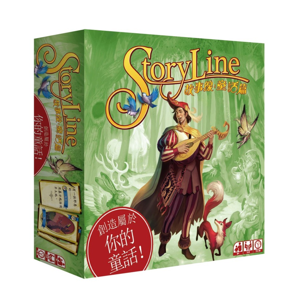 遊戲名稱:故事線/童話篇 遊戲類型:派對/親子/家庭/說故事/兒童/表達/聯想 遊戲時間:30分鐘 適合人數:3~8人 遊戲介紹: 故事線:童話篇是款合作說故事的遊戲,鼓勵玩家添加各種元素到故事中並修飾它。每回合玩家講故事時,需要向其他玩家詢問特定類型的卡片,如位置與對象等。一起從手中選擇一張牌!看看誰的牌最獲得大家的喜愛與青睞。得分的同時創造最有趣的童話故事吧。