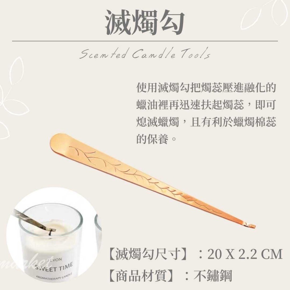 ★★【滅燭勾】:熄滅蠟燭時如果直接吹熄蠟燭會產生黑煙,破壞蠟燭的香氣。可以使用滅燭勾把燭蕊壓進融化的蠟油裡再迅速扶起燭蕊,即可熄滅蠟燭,且有利於蠟燭棉蕊的保養。