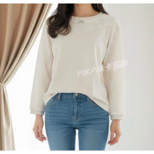 《MIKA米卡服飾》甜美蕾絲拼接長袖上衣 長袖T恤 刺繡拼接上衣 韓版棉T 棉T 長袖 蝴蝶結別針上衣 女裝