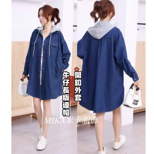 《MIKA米卡服飾》牛仔外套 牛仔長版連帽開釦外套 外套 丹寧 長袖 牛仔 長版 帽可拆 牛仔襯衫外套 牛仔洋裝 女裝