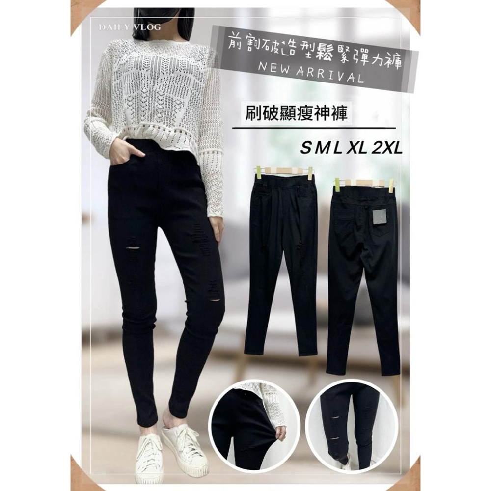 https://s-cf-tw.shopeesz.com/file/tw-11134208-7rbka-mawql20ugj4m7b 🌟刷破顯瘦神褲 👉彈力挺布料小刷破造型款呦! 👉做鬆緊腰頭伸縮有彈性穿脫超方便 👉整件超彈力布料穿起來舒舒服服的~ 👉視覺上看上去顯瘦度佳,整個自帶修飾曲線! 👉不管你要當外穿或是當內搭穿都很可以呦! 👉簡單基本款式好搭又不退流行 🌟商品平量(cm) S 腰31 臀40 長97 M 腰33 臀42 長97 L 腰35 臀44 長97 XL 腰37 臀46 長98 2L 腰39 臀48 長98 ps.商品平量有正負2-3cm誤差為正常範圍