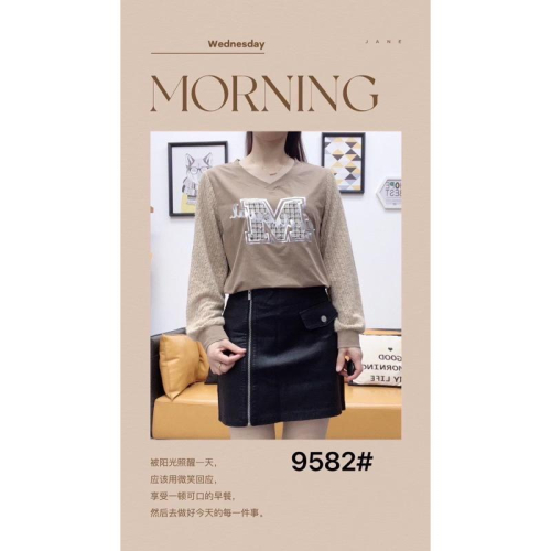 《MIKA米卡服飾》V領長袖棉上衣 時尚英字棉上衣 萊卡棉 彈力棉上衣 釘珠棉上衣 蕾絲袖棉上衣 長袖棉上衣 女裝
