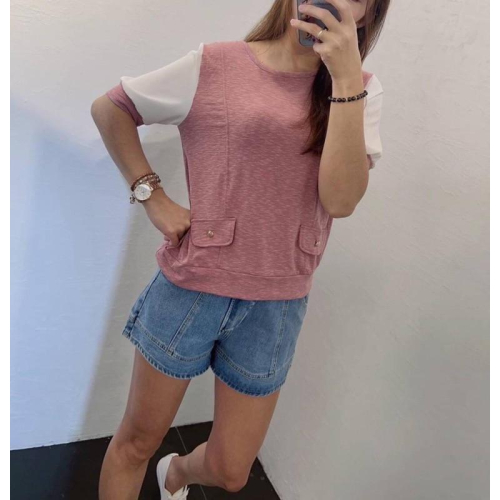 《MIKA米卡服飾》拼接雪紡袖棉T 假蓋袋棉T 素面棉T 配釦 涼感T 彈力棉T 短袖上衣 薄棉T 韓版棉T 女裝