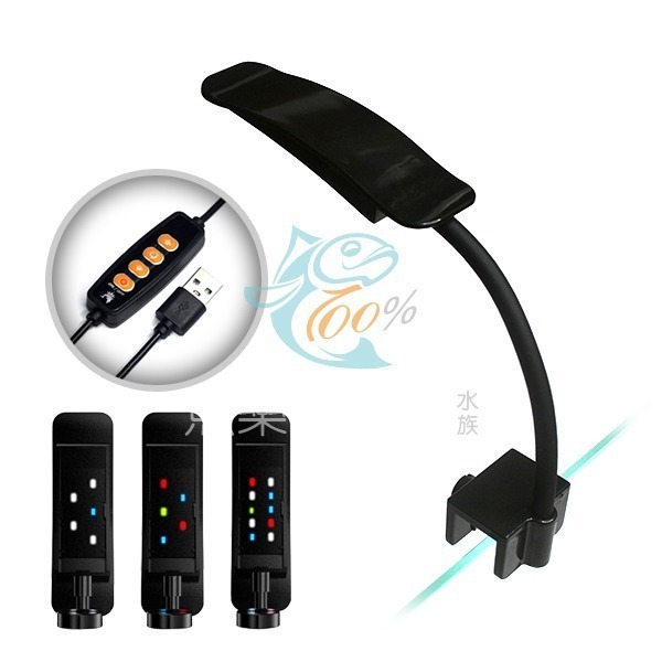 - 將燈具夾在魚缸缸壁上並轉動夾子上的螺絲加以固定,再依自己喜好調整角度。