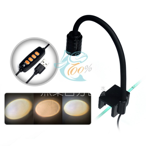 - 將燈具夾在魚缸缸壁上並轉動夾子上的螺絲加以固定,再依自己喜好調整角度。
