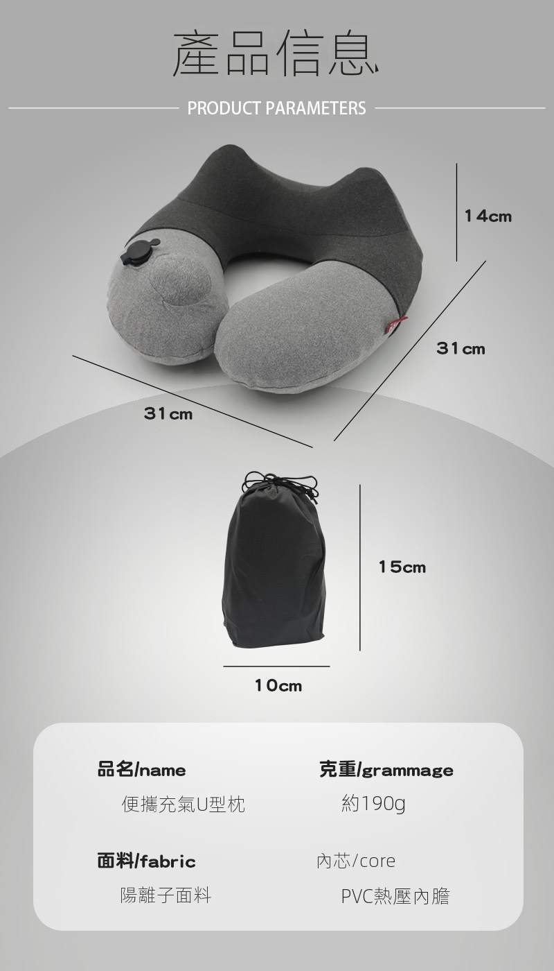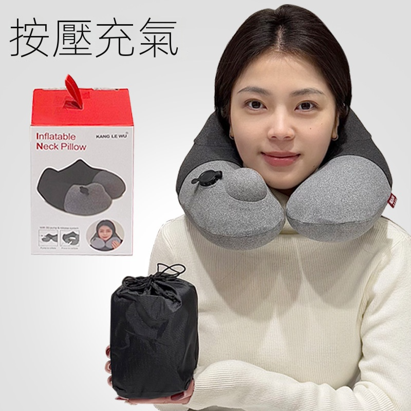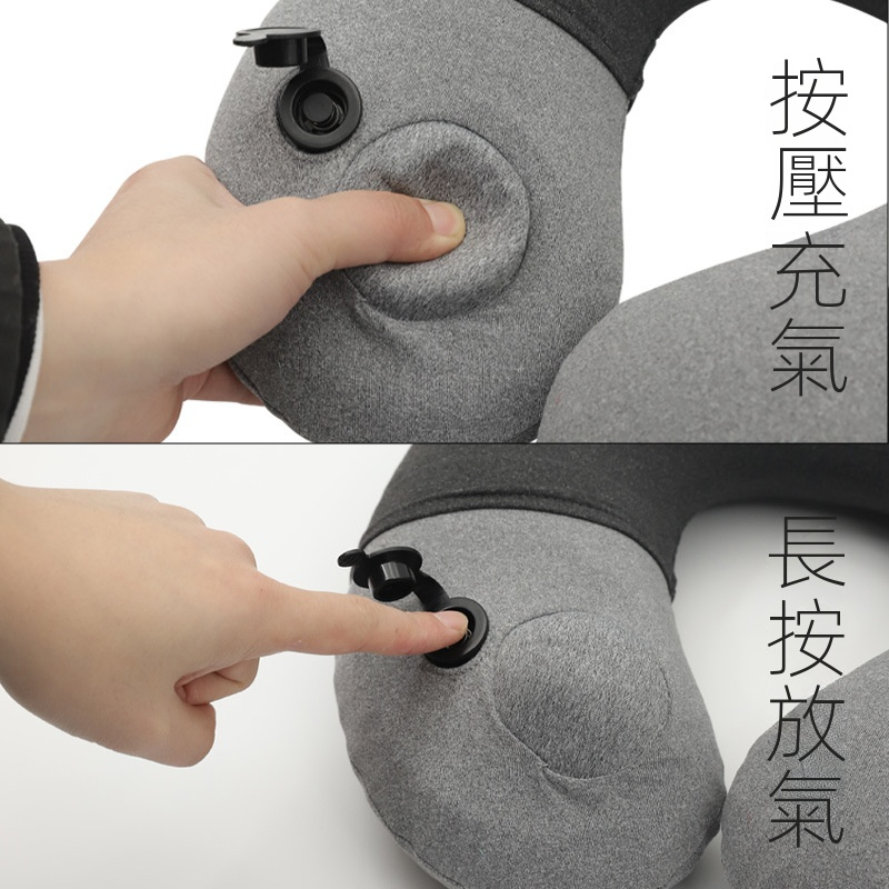 這款免電手充氣式U型枕,只要手按幾下即可自動充氣,無需嘴吹也不用外接電源。