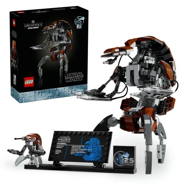 - 拼砌、展示與遊玩-這款 583 片裝的盒組中,積木組成的 Droideka 樂高® 機器人玩偶直立高逾 21 公分