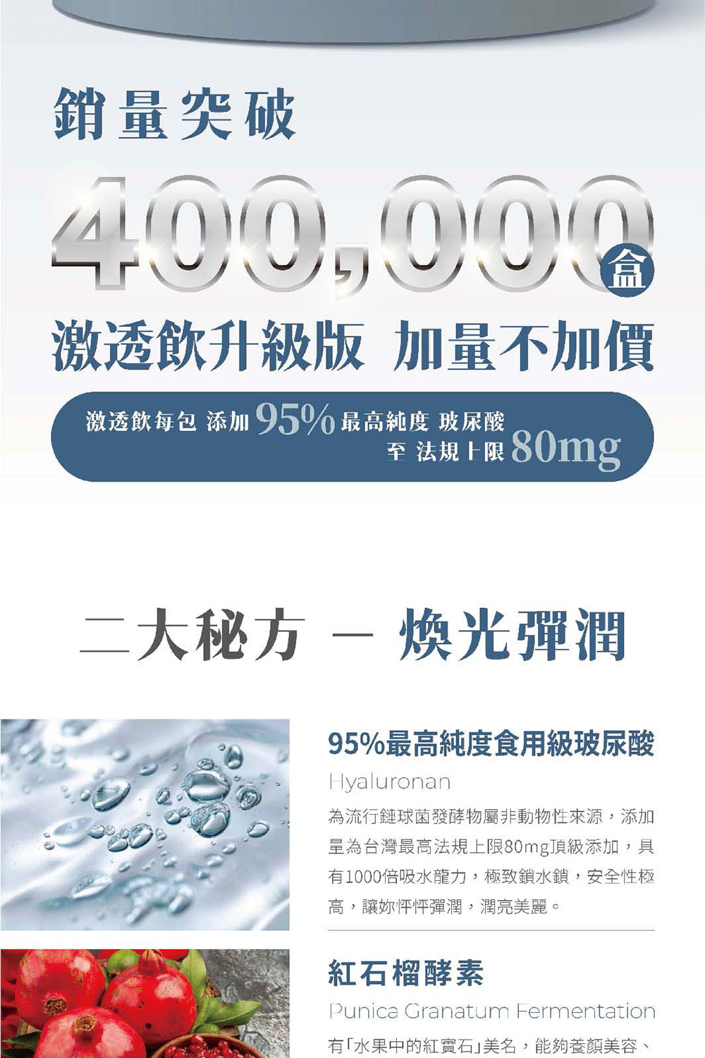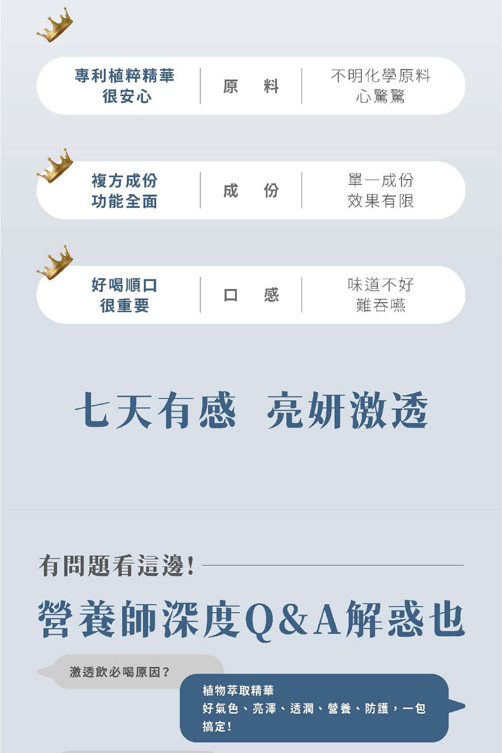 榮獲國際獎項的純淨植萃精華,搭配80mg最高劑量、95%最高純度添加玻尿酸讓妳潤澤閃亮成為萬眾焦點