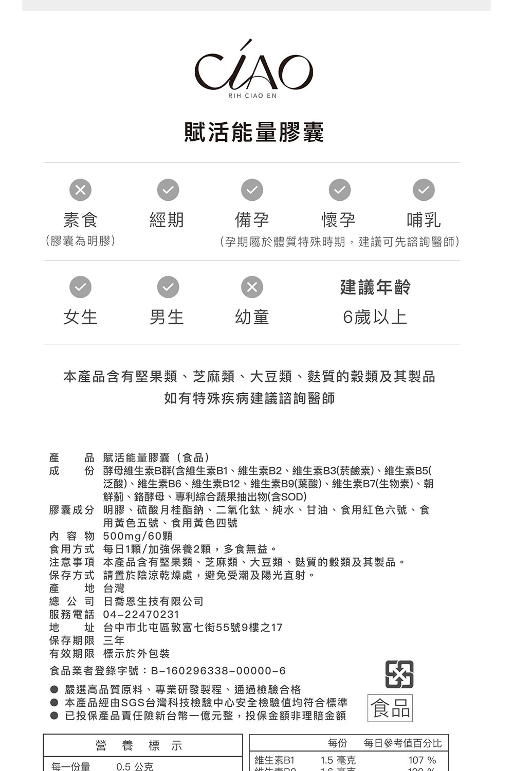 本產品含有堅果類、芝麻類、大豆類、魅質的穀類及其製品 如有特殊疾病建議諮詢醫師