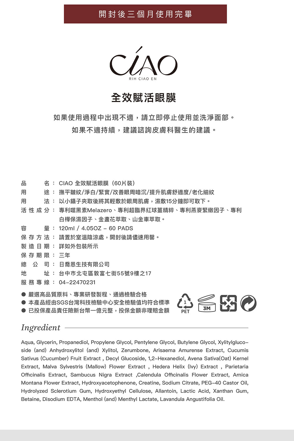 日喬恩|全效賦活眼膜 (全眼周包覆 眼部保養 眼周 眼膜 面膜 肌膚保養 淡化細紋 緊實眼周)