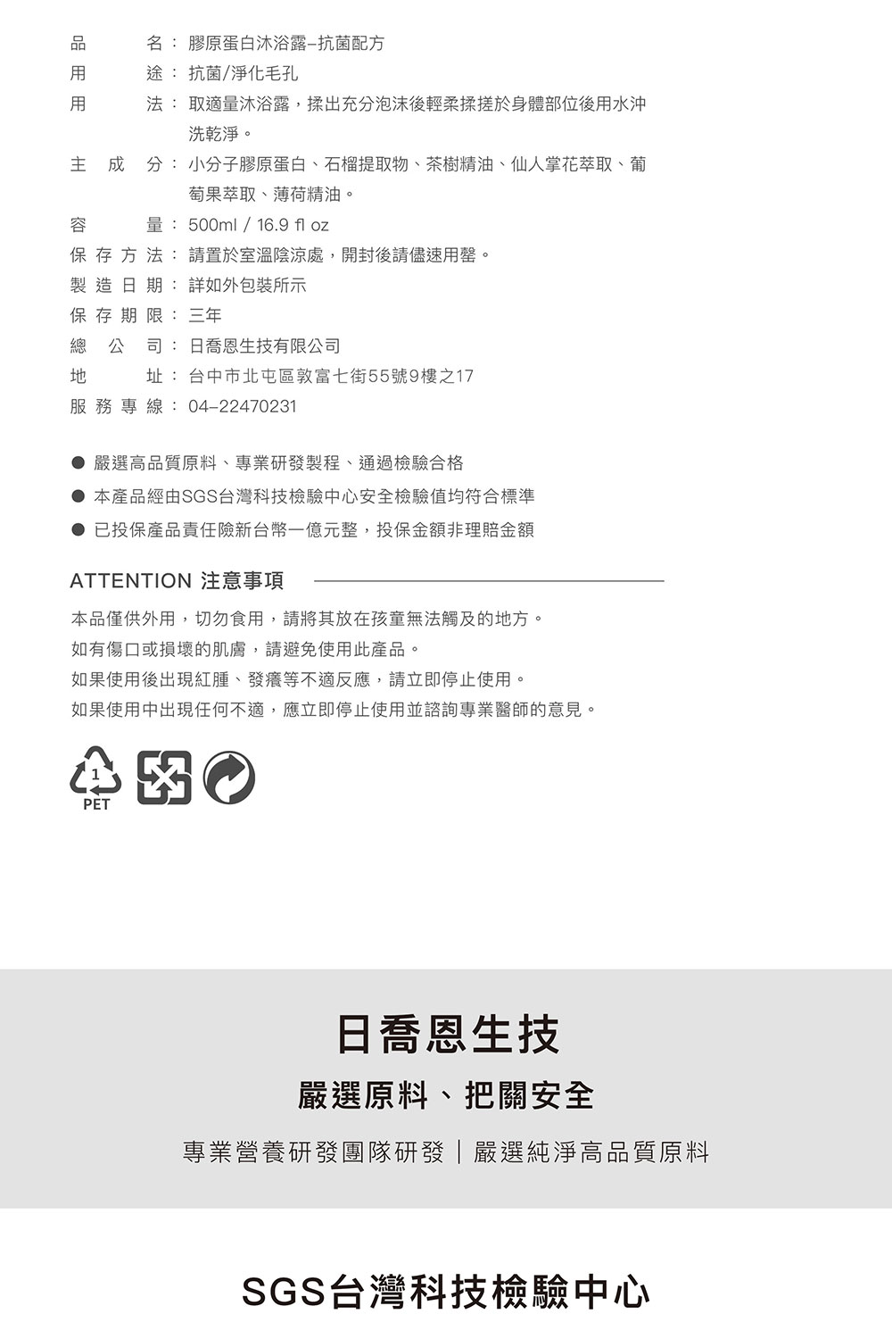 日喬恩|膠原蛋白沐浴露-抗菌配方 (沐浴乳 洗澡 淨化肌膚毛孔 薄荷精油 專利認證抗菌 肌膚角質更新)