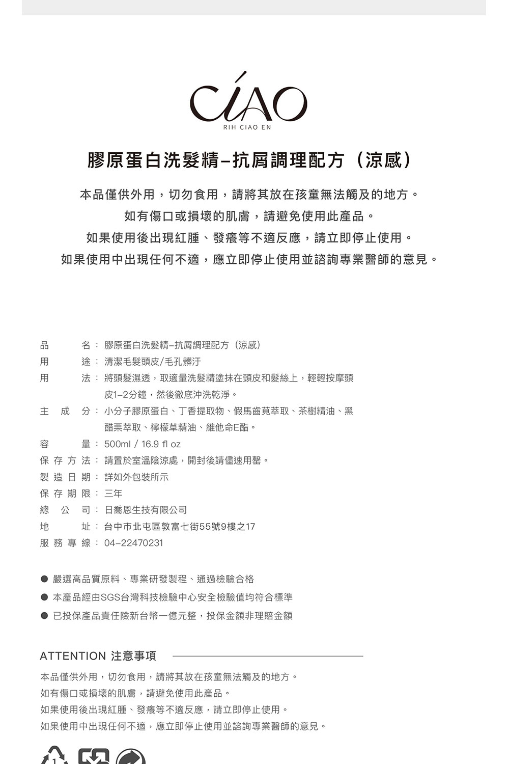 日喬恩|膠原蛋白洗髮精-抗屑調理配方(涼感)洗髮乳 涼感洗髮精 CIAO 洗髮 止癢 抗屑 清潔毛髮 涼感 清爽