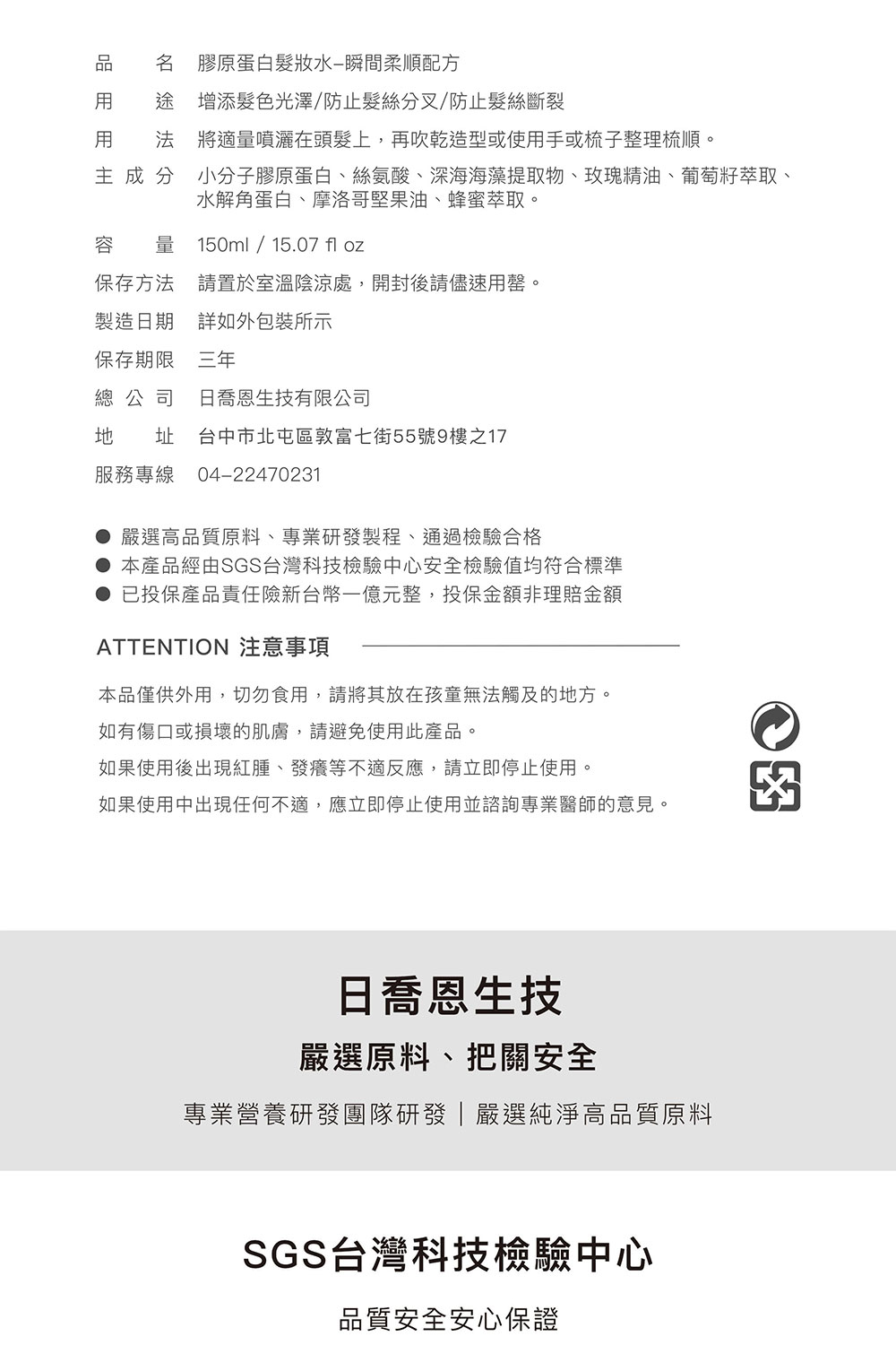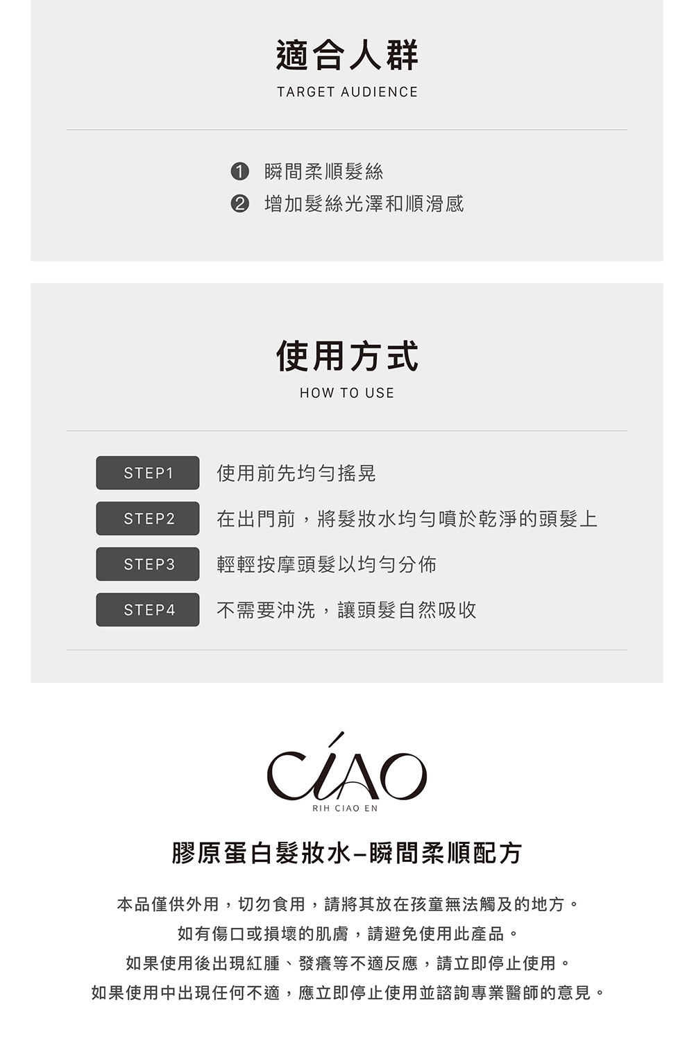 日喬恩|膠原蛋白髮妝水-瞬間柔順配方 (護髮 養髮液 修護 保濕噴霧 CIAO 洗髮精 髮妝水 膠原蛋白 防止分叉 )