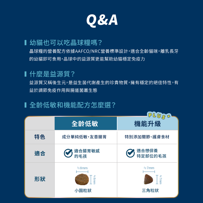 獨特益生菌凍乾晶球糧配方,增強貓咪腸道健康。