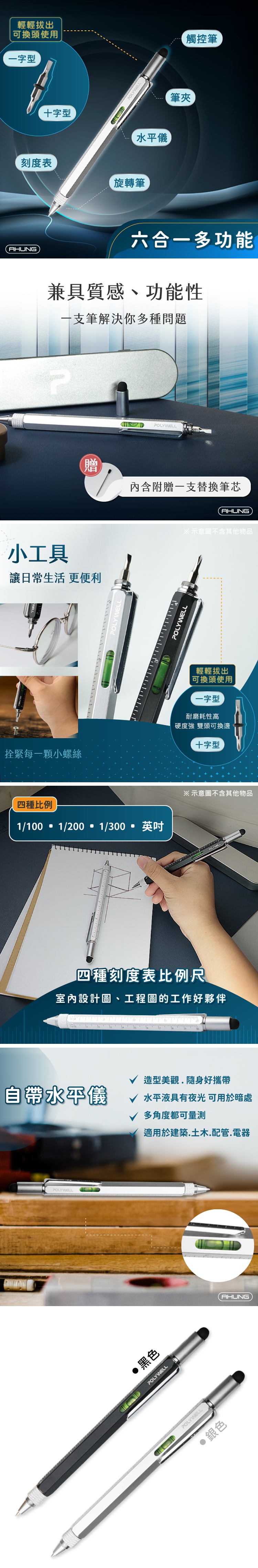 .功能:一字、十字型螺絲起子、觸控筆、尺、水平儀、旋轉筆