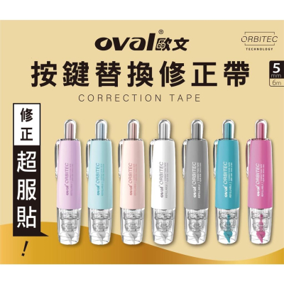 ●產品特色  超薄膜帶芯,修正快又順。 旋開機身放入內帶,簡單更換。 輕鬆導正不停頓,細字修改超滑順。 專利旋轉機構,任何角度都可平貼修正。 產品名稱:按鍵式筆型修正帶 產品規格:5mm×6M 產品型號:QSR-506 產品成分:塑膠、鈦白粉 產品顏色:藍、黑、粉、透明 產品產地:越南 有效期限:5年 ==========================================  修正帶 歐文 Oval QDR-506 橡皮擦雙用修正帶  ●產品特色  超薄膜帶芯,修正快又順。 旋開機身放入內帶,簡單更換。 輕鬆導正不停頓,細字修改超滑順。 專利旋轉機構,任何角度都可平貼修正。 底部是橡皮擦 兩用修正超方便。 產品名稱:橡皮擦修正帶 產品規格:5mm×6M 產品型號:QDR-506 產品成分:塑膠、鈦白粉 產品顏色:藍、黑、粉、透明 產品產地:越南 有效期限:5年 ============================= 歐文 Oval QRM-506T 修正內帶 替換帶 全尺寸共用(除了迷你款的不適用) ●產品特色  超薄膜帶芯,修正快又順。 旋開機身放入內帶,簡單更換。 輕鬆導正不停頓,細字修改超滑順。 專利旋轉機構,任何角度都可平貼修正。 產品名稱:修正內帶(歐文修正帶替換用) 產品規格:5mm×6M 產品型號:QRM-506T 適用機型:QSR-506、QDR-506、(以前的舊款也通用喔) 產品成分:塑膠、鈦白粉 產品顏色:透明殼 (灰頭.白頭.透明頭)隨機出貨 有效期限:5年