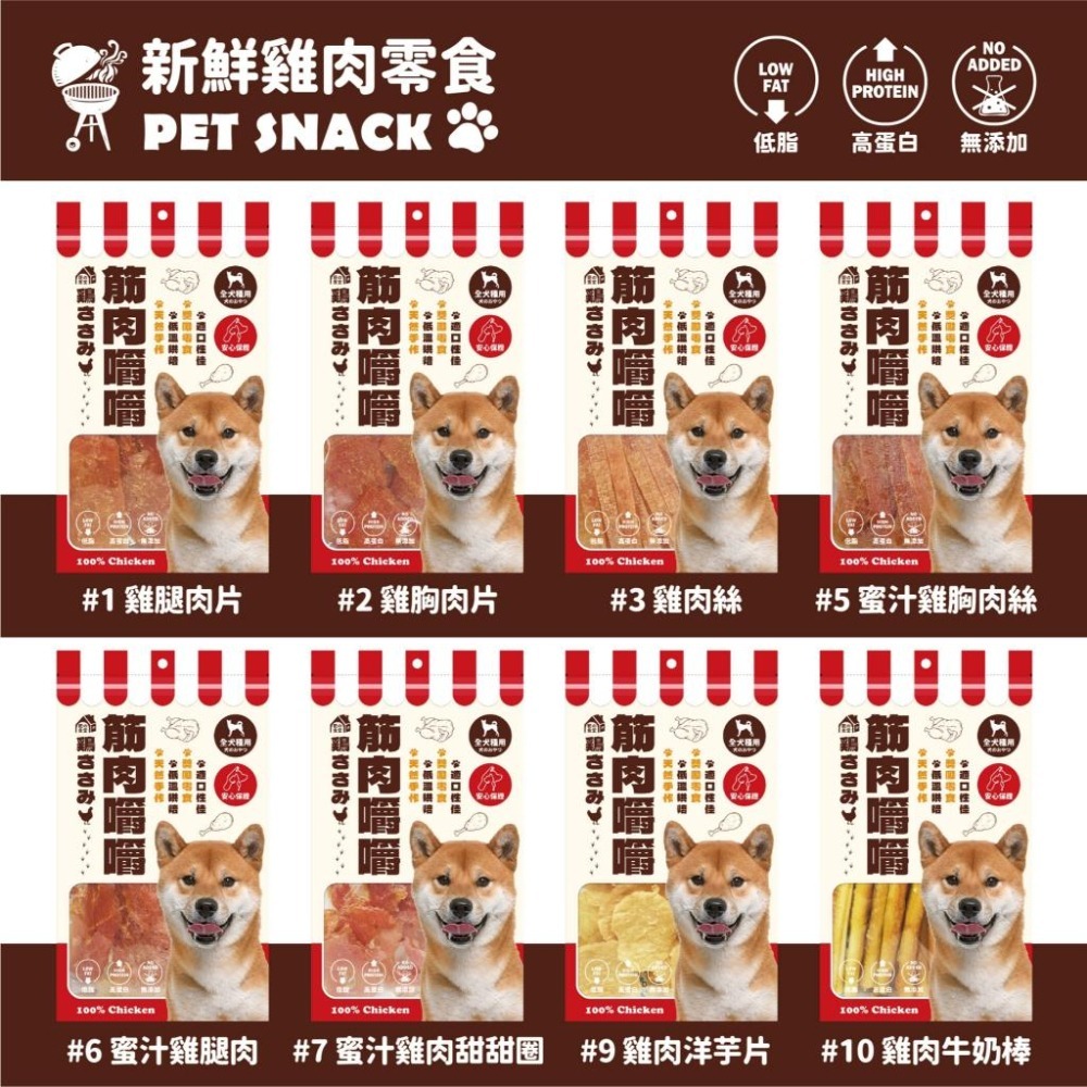 口味:雞腿肉片、雞胸肉片、雞肉絲、蜜汁雞肉絲、蜜汁雞腿肉、蜜汁雞肉甜甜圈、雞肉洋芋片、雞肉牛奶棒