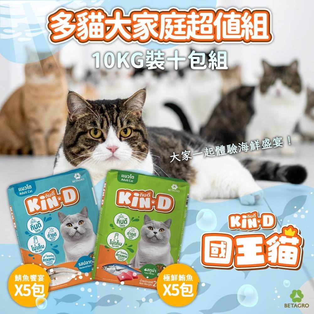 品牌:KIN D 國王貓 商品:活力貓糧 規格:鯖魚饗宴 x 5包、極鮮鮪魚 x 5包 重量:10kg