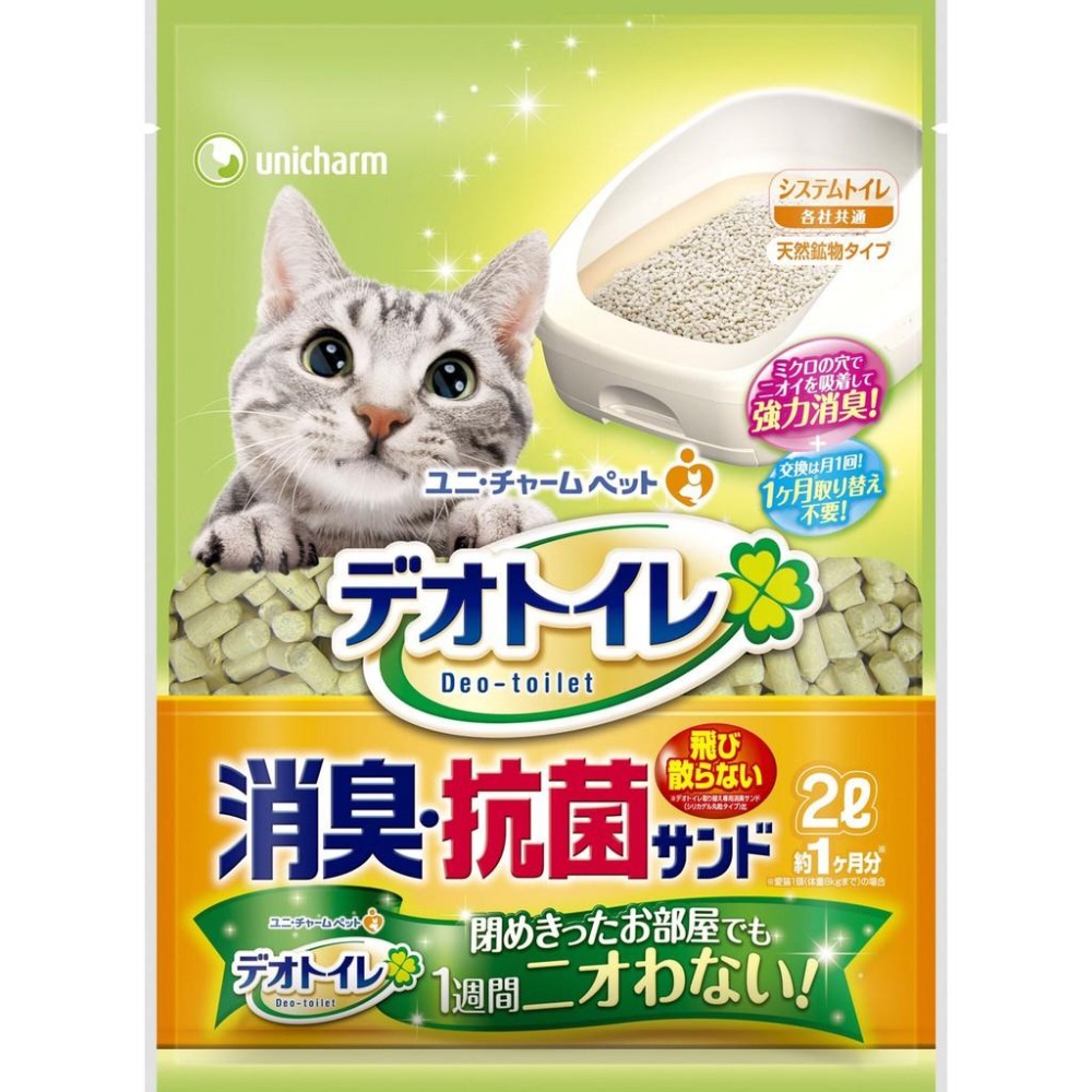 產品特色: ~ 天然沸石成份和矽膠相互配合的高除臭效果。 ~ 速乾性,表面總是乾爽好清理。 ~ 適合所有雙盆貓砂盆,建議搭配 日本unicharm嬌聯 雙層貓砂屋UC6265。 ~ 此款貓砂會吸收尿臭,尿液再由貓砂盆下層尿布吸收。 ~ 以難夾在肉墊間的新長條狀來防止飛散,是愛貓容易習慣的形狀。 ~ 一包約可用一個月以上!