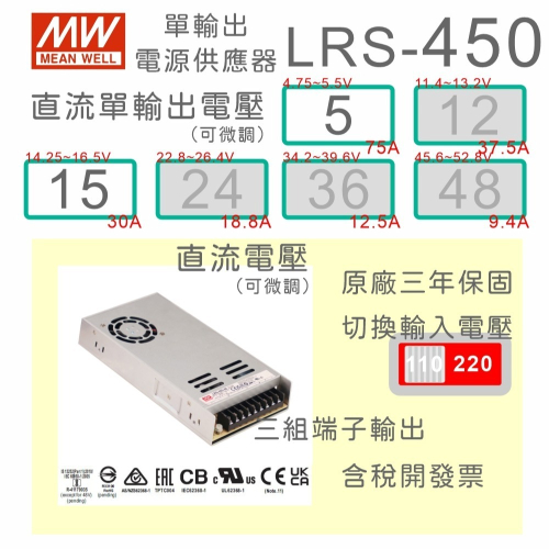 【保固附發票 】MW明緯 450W LRS-450-5 5V 15 15V 變壓器 監視器 LED燈 馬達 電源