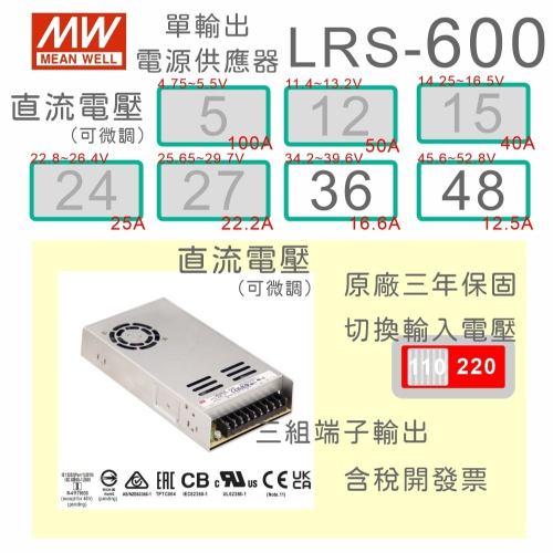 【保固附發票 】MW明緯 600W LRS-600-36 36V 48 48V 變壓器 監視器 LED燈條 馬達 電源