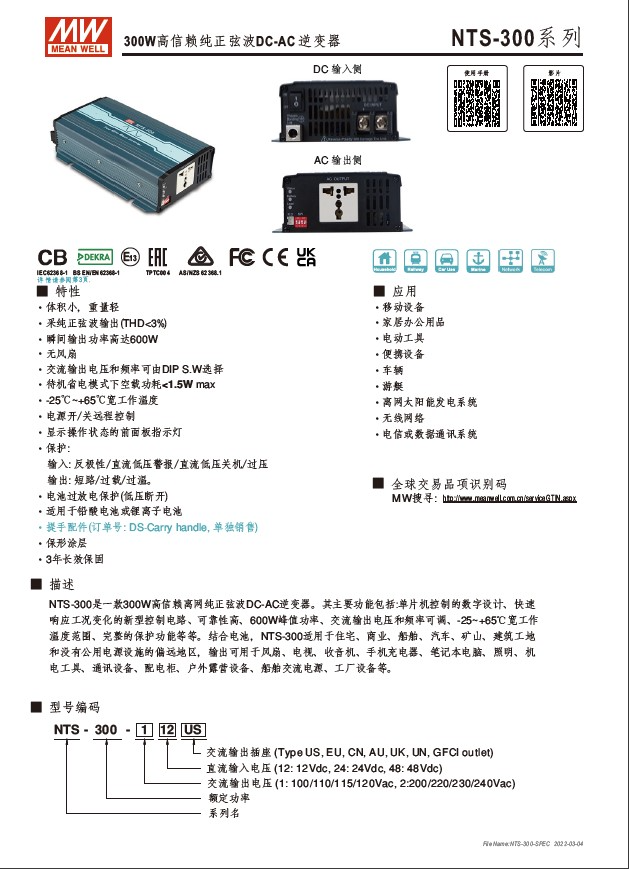 明緯逆變器NTS-300/450有別於一般市售消費性等級,最大特色是採工業級高可靠、高安全性、高品質並融入環保高效能概念設計,且導入全新數位化智能芯片及嚴選用料,主要特點有 : 尺寸小輕量便攜、93%高效能、瞬間功率可達2倍輸出、可彈性自調AC輸出電壓/頻率及節能模式、遠端ON/OFF遙控、多重智能保護(異常自動關機)、可操作-25~+70℃、歐/美/中國及萬用插皆為標準品有庫存現貨,交期短、通過國際認證及3年長效保固….等,可使用於家用/辦公室、車用、遊艇、偏遠地區無AC電力網或移動式AC電源.….等場合,如 : 驅動電視、電腦、手機充電、音響、照明、電扇、移動式醫用推車…….等。